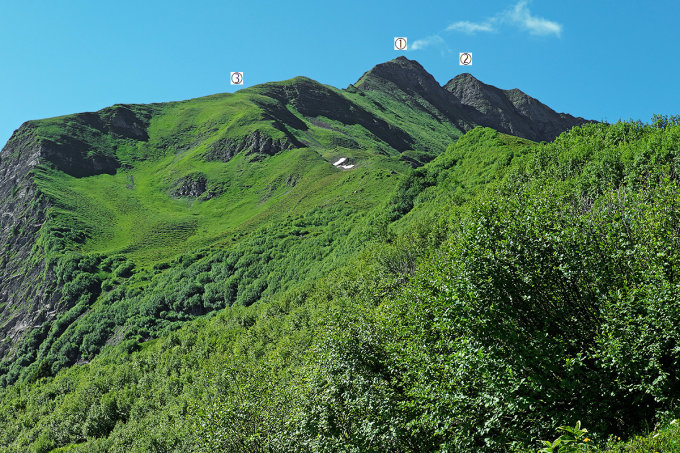 Ab hier folgt man dem rückenartigen Nordgrat in Gras und Schrofen bis zum höchsten Punkt.