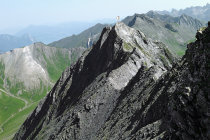 Der felsige Gipfelaufbau wird in leichter, aber abschüssiger Kletterei bis Schwierigkeitsgrad II in leidlich solidem Gestein idealerweise möglichst am Grat bleibend angegangen.