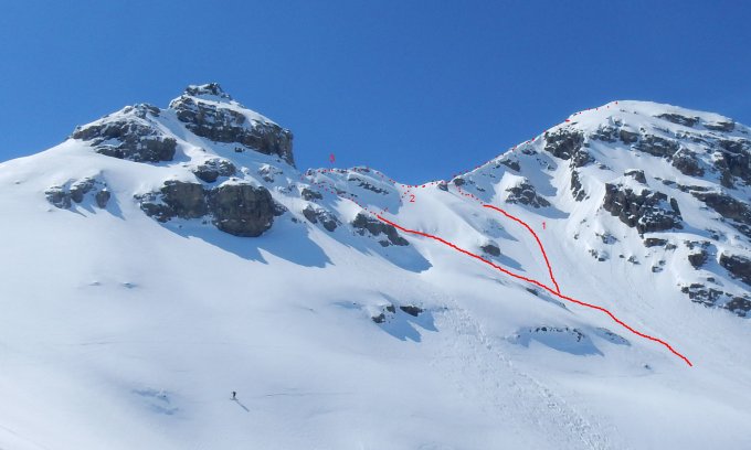 1) ganz rechts im langen Couloir. Der direkteste Weg, aber wohl auch am gefährlichsten bezüglich Lawinen.