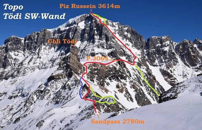 Von der Planurahütte abfahren in Richtung Sandpass. An geeigneter Stelle (abhängig von der Schneelage) zum Gratausläufer des Chli Tödi aufsteigen (siehe Topo). Auf der anderen seite leicht absteigen um das markante Couloir südlich des Chli Tödi zu erreichen. Dieses aufsteigen und oben auf dem flachen Grat weiter aufsteigen bis zum Gratausläufer des Piz Russein. Dort beginnt die Querung (im Frühjahr erst im Fels/Schutt und dann im Schnee).