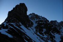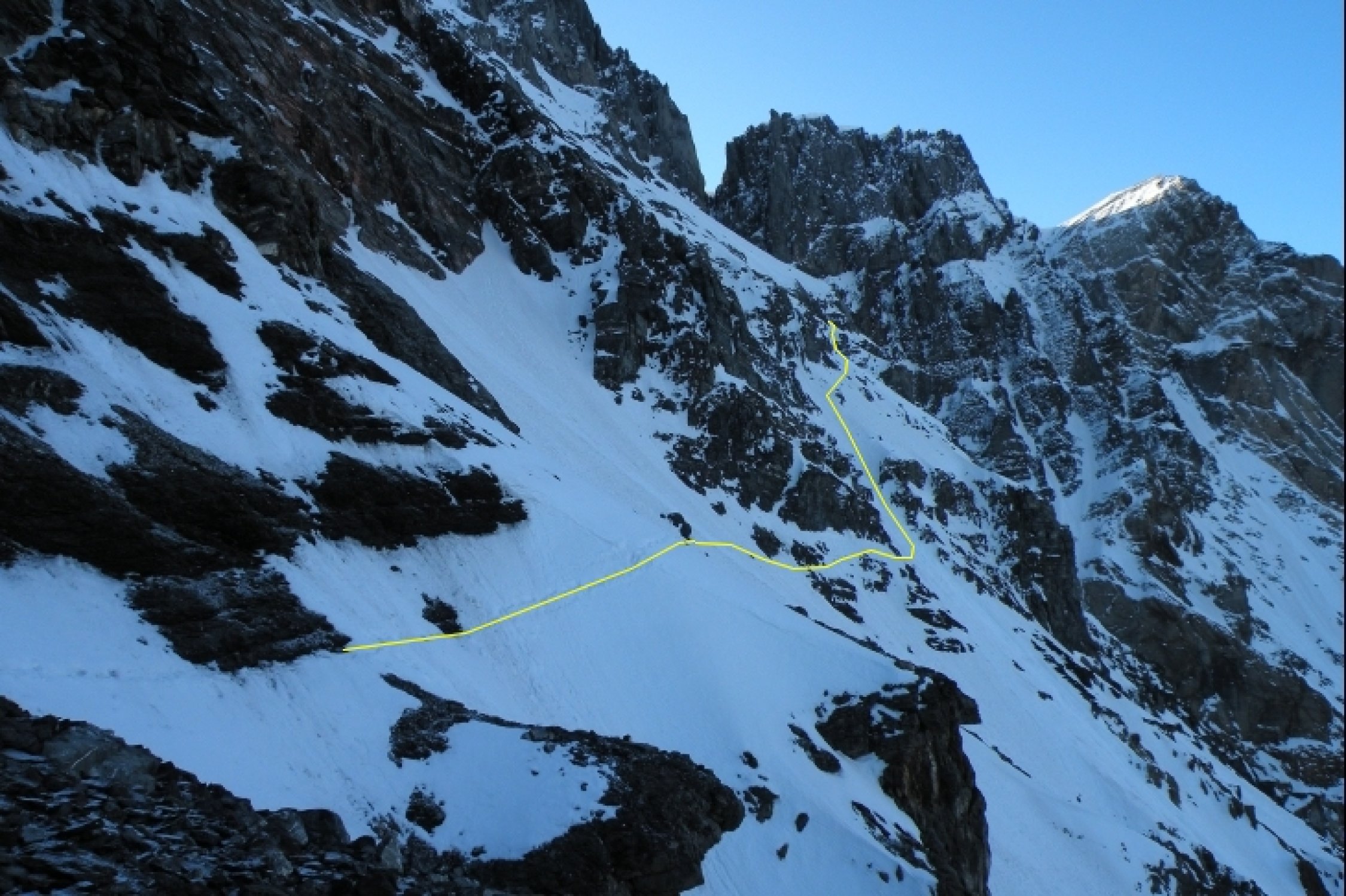Die Querung führt dann in ein Couloir (siehe Foto) welches an dessen Ende rechtshaltend verlassen wird. Anschliessend direkt die 45-50° steile Wand in der Falllinie aufsteigen. Oben versperren dann verschiedene Türme den Weiterweg. Rechts von den zwei markanten Felstürmen gibt ein Durchschlupf durch welchen man den Gipfelhang verlassen und weiter oben rechtshaltend zum Südgrat gelangen kann.