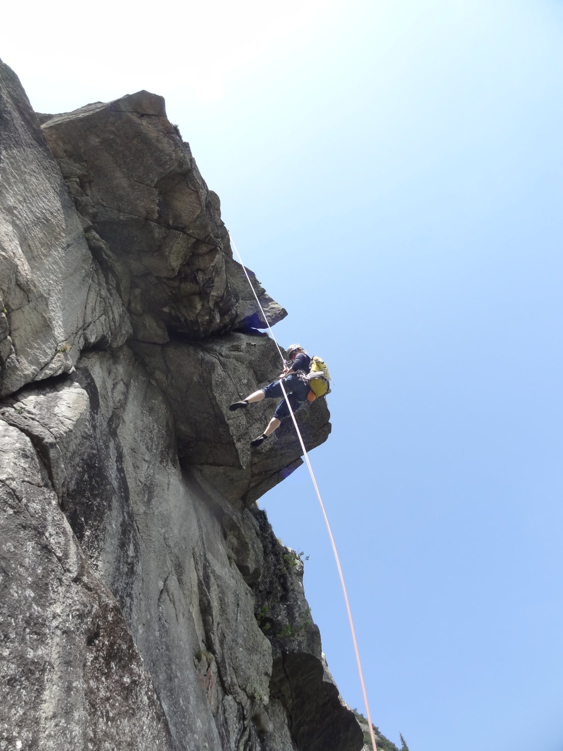 Abseilen: 60 m Halbseil empfehlenswert (unsicher, ob die nachfolgende Variante mit 50 m Seilen auch geht).