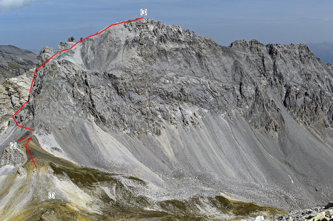 Hier steigt man in anfänglich heikler Kletterei in brüchigstem Fels im oberen II. Schwierigkeitsgrad über eine Art seichter Einbuchtung gerade empor zum grossen Schuttfeld unterhalb des höchsten Punktes. Die ersten, fast senkrechten Meter der Kletterei bilden die Schlüsselstelle der Tour, anschliessend wird das weiterhin steile Gelände rasch gestufter und einfacher.