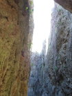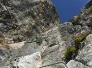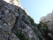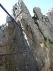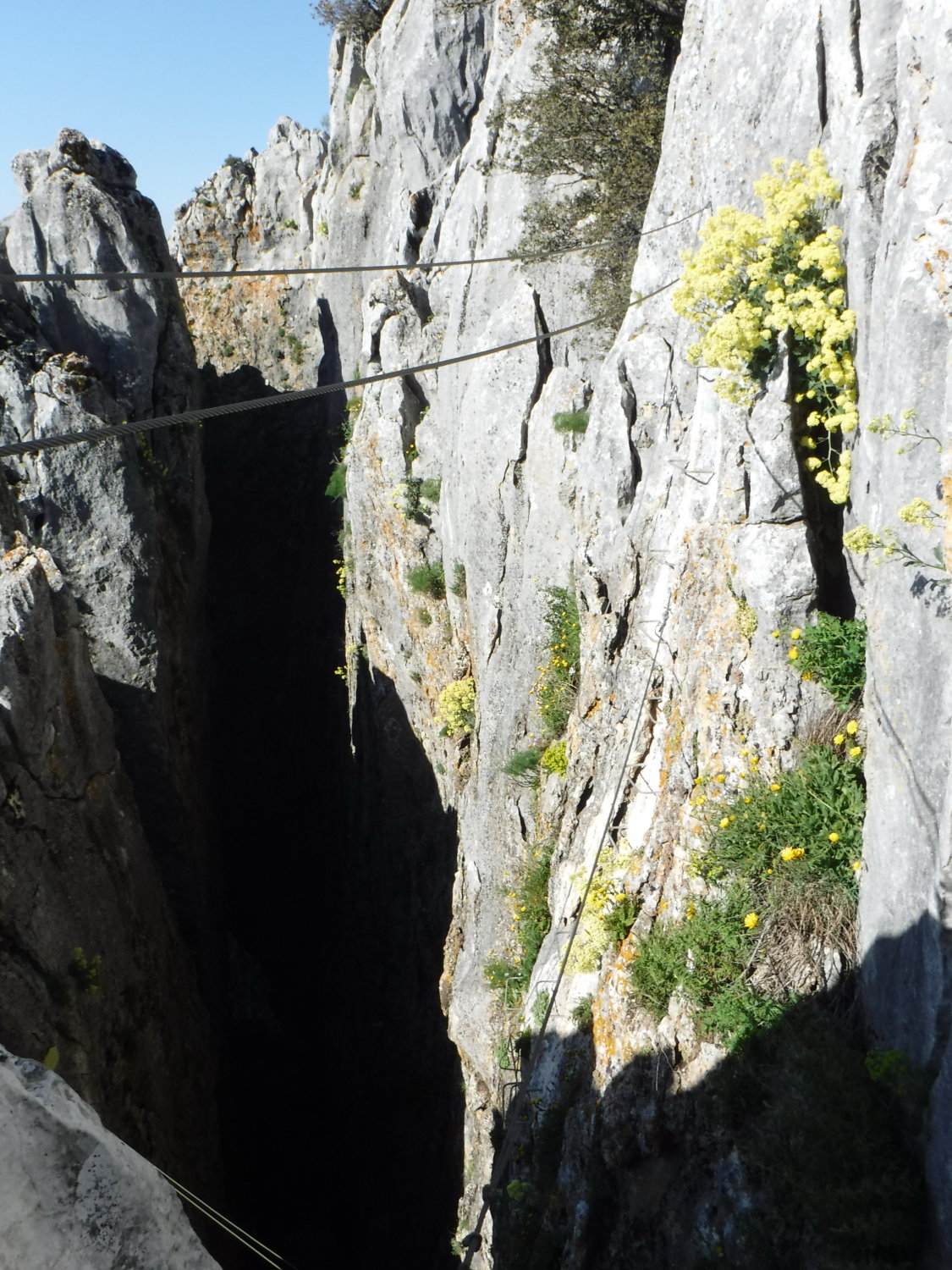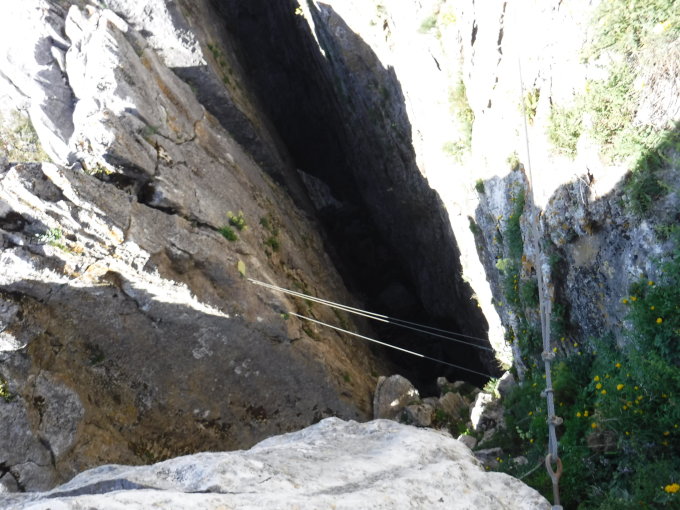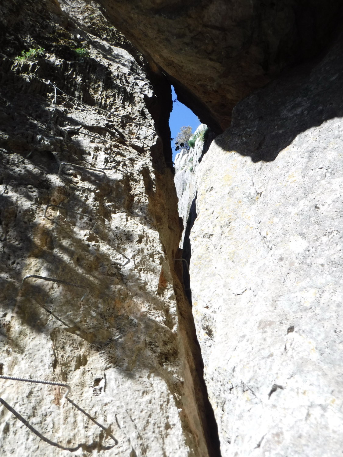 Oder man klettert über die Ferrata Benadalid (KS 3) ab, obwohl beim dortigen Ausstieg ein gesperrtes Einbahnstraßenschild steht. Wenn man früh genug unterwegs ist und beim Klettern keine Aktivitäten auf linker Seite in der Ferrata de Benadalid mitbekommt, ließe sich über diese einfach abklettern, ohne Gegenverkehr zu stören.