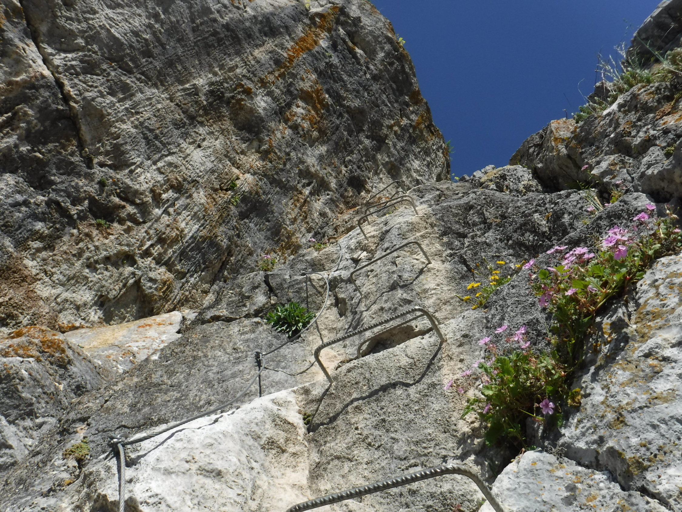 Der 2010 errichtete Klettersteig ist auf 97 Hm Länge gesichert und führt durch die ostseitige Felswand an rechter Seite einer Felsverschneidung über Eisenbügel 35 m nach oben. Das Sicherungsseil ist an linker Seite in kurzen Schlaufen verlegt mit sehr kurzen Ankerabständen. Dann dreht die Richtung kurz nach rechts, um anschließend nach links zu queren und in eine kleine Scharte abzuklettern. Dann geht’s auf sandigem felsband hinauf zu einem Felskamin. Letztes Wandstück zum höhlenartigen Schaft klettert man auf Eisenbügel zur Innenseite des breiten Kaminlochs. Dieses überhangelt man auf einer 10 m langen 2-Seil-Brücke mit Sicherungsseil darüber. Auf anderer Seite führen Eisenbügel hinauf zur nächsten 2-Seil-Brücke. Diese 7 m lange Puente hat ebenfalls oben drüber ein zusätzliches Sicherungsseil. Nach 30 min. steht man auf dem Karstplateau.