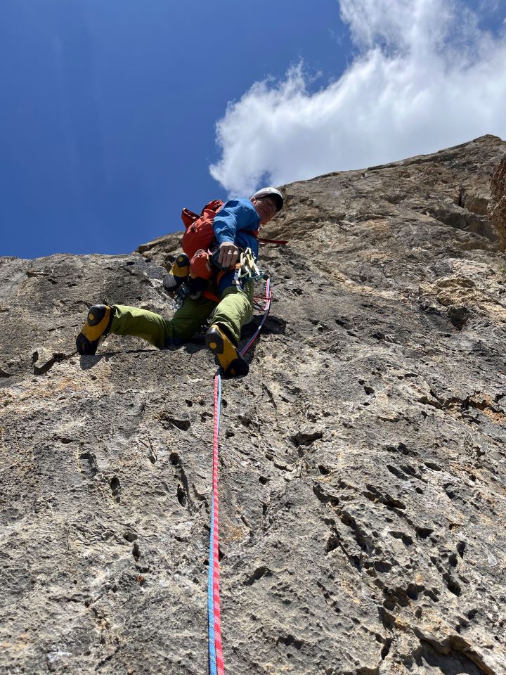 SL 9 (45 m, 6a(+)): Crux und Herz der Tour. Zunächst an Rissstrukturen durch die sehr steile Platte. Weiter oben dann Schlitze und sehr rauher Fels. Im obersten Teil nicht so dicht gesichert, wie Rest der Tour (an der Crux in der ersten Hälfte ist die Sicherung super).