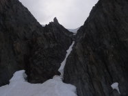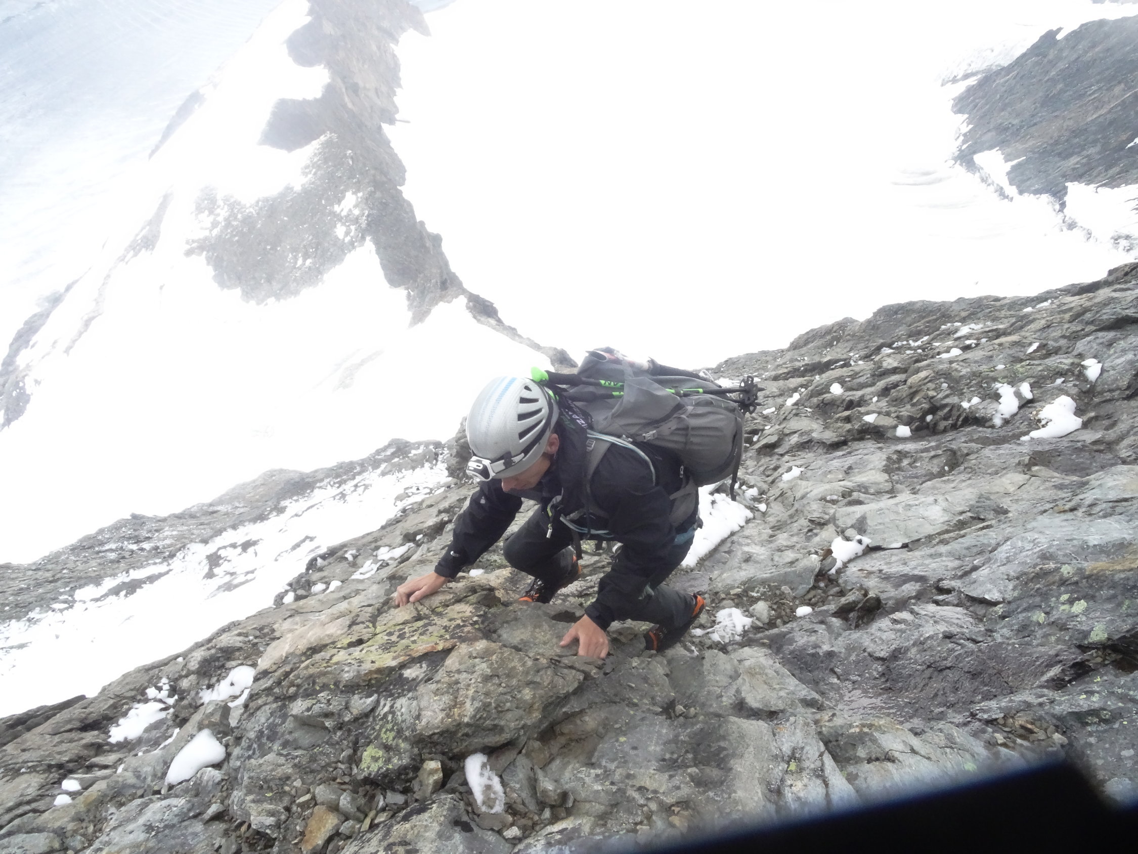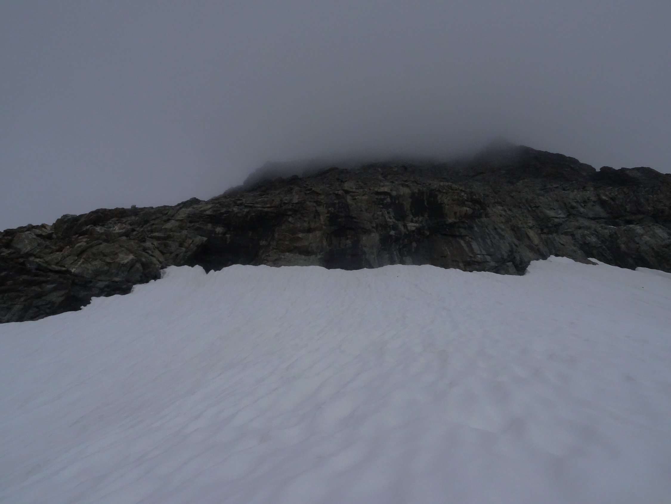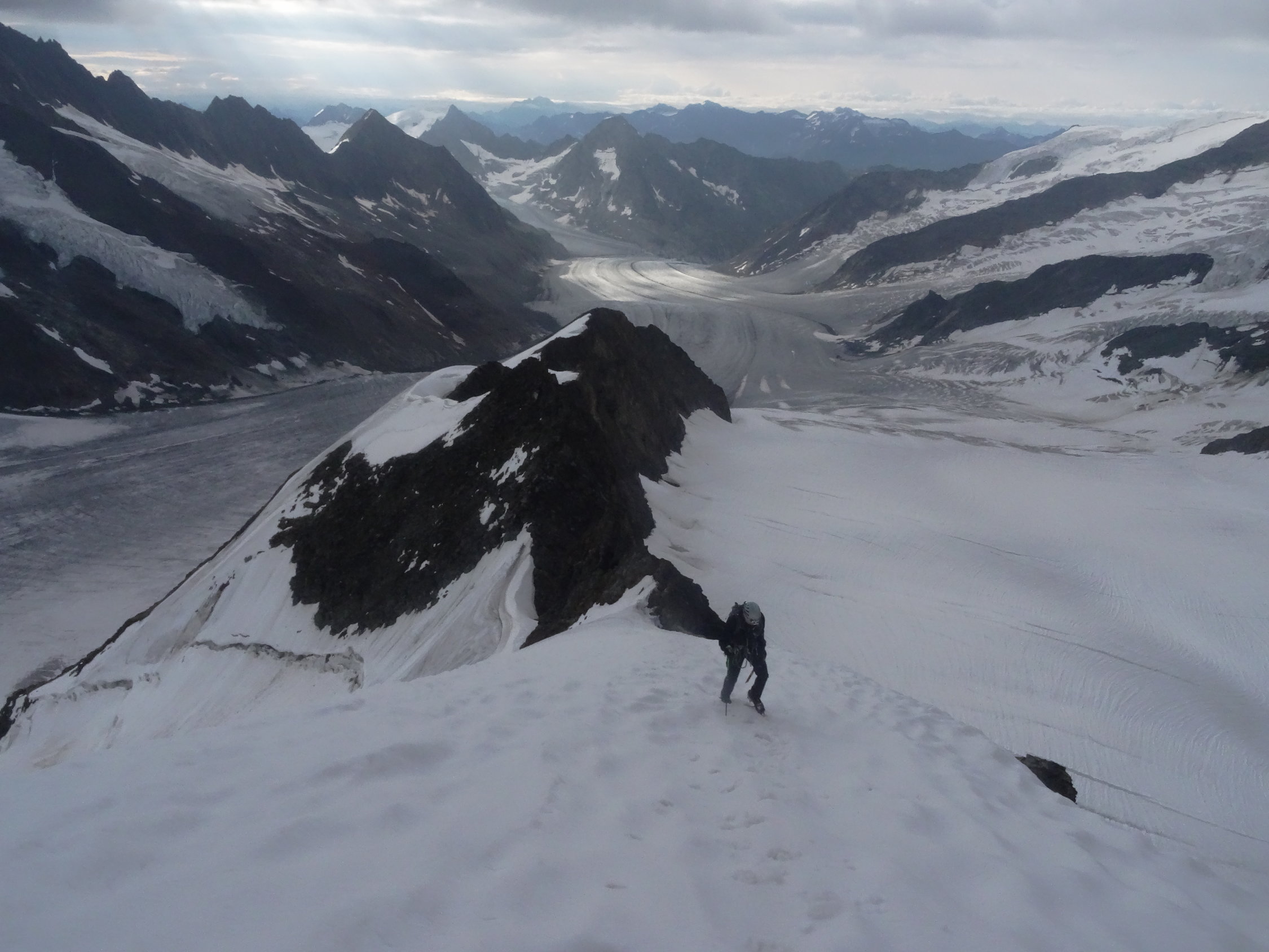 Von der Finsteraarhornhütte über Walliser Firescherfirn in den Gletscherkessel, zwischen den SE-Gräten des Gross Grünhorns und Grünegghorns. Ein im unteten Teil aussperrtes, steiles Schneecouloir(viele lose Steine)[siehe Foto] führt knapp 100 m nördlich P.3585 nach rechts (NE) auf den SE-Kamm des Gross Grünhorn. Über den Firngrat und ein steiles Firnfeld in die Felsen des Wand. Immer links der Rinne, der schwach ausgeprägten Scharte die sich knapp südöstlich des Gipfels herabzieht.(viel loses Gestein)