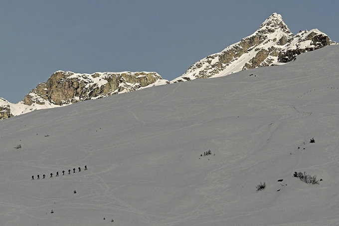 Klassische Tourenausrüstung. Gipfelaufstieg meistens ohne Steigeisen/Pickel machbar.