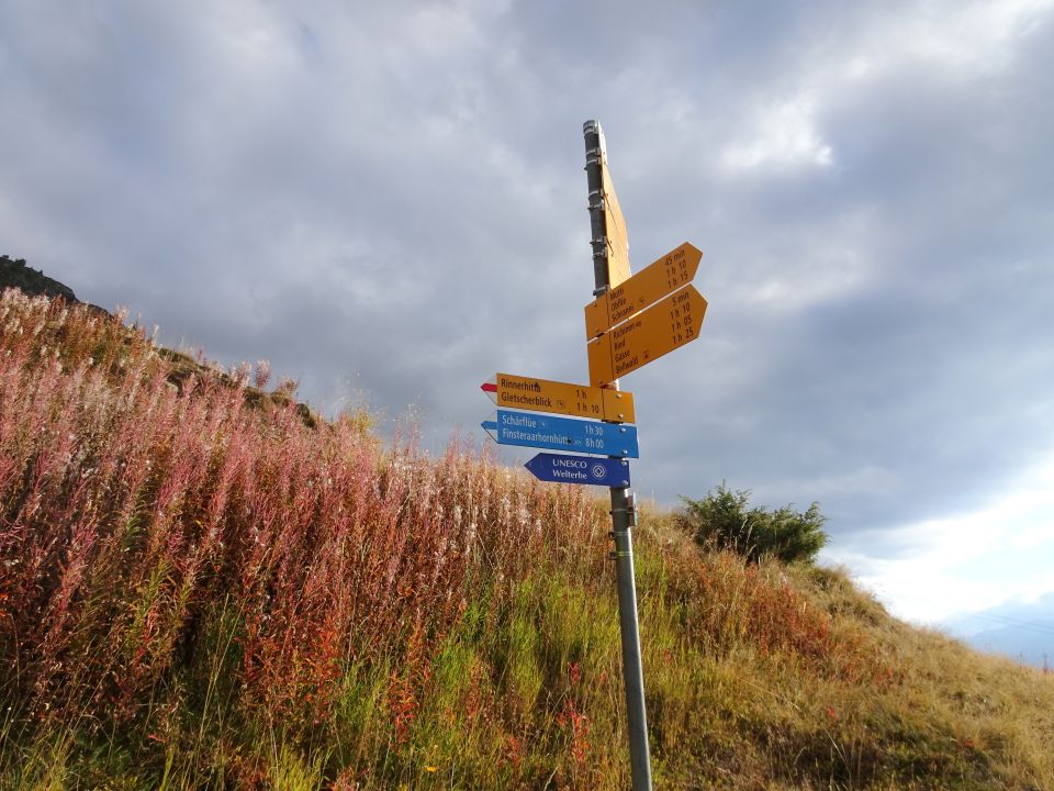 Von Bellwald mit der Richinen Sesselbahn nach Mittelstation Richinen. Hier dem Wanderweg folgen der mit wenig Steigung den Talhang quert bis zum Gletscherblick. Bis hier ist der Weg gut und leicht (T2). Der Weg, der gleichzeitig zur Finsteraarhornhütte führt, wir nun zum B/W d.h. schwieriger mit schmalen, zum Teil unterbrochenen Stellen und teilweise ausgesetzt. Einige exponierten Stellen und Absätzen sind mi Fixseilen und Metaltritten gesichert. (T3-T4) Oberhalb der früheren grossen Weide erreicht man eine flache Stelle bei Pkt 2403 m. Hier Blaue Wegweiser Richtung Finsteraarhornhütte (6 Std). Von Risihorn keine Spur.