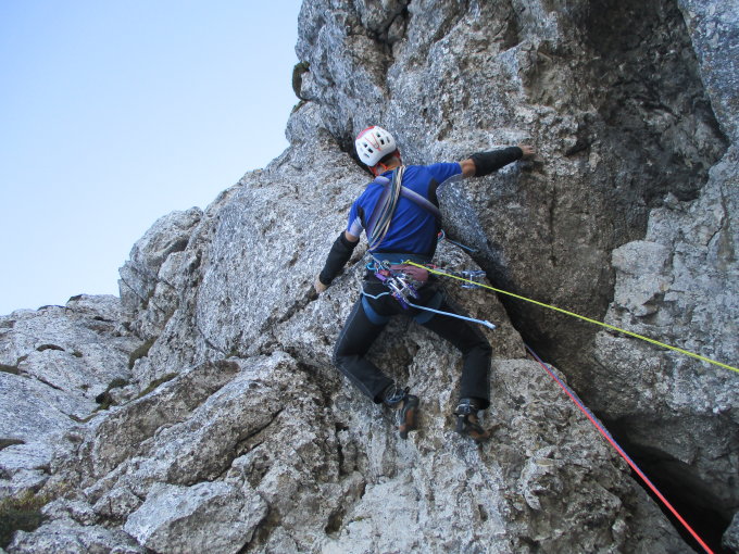 Charakterisierung: Eindrucksvolle neue Direktroute in ernstem Ambiente. Sehr abwechslungsreich: Risse, Löcher und Henkel aller Arten sowie ein luftig-fotogener Quergang. Unten fast Plaisier, nach oben hin immer steiler, exponierter und herber. In der 7. Länge sehr anstrengend und aufgrund der Felsqualität evtl. etwas bedrückend für´s Gemüt. In der letzten Länge folgt ein bombenfester überhängender Offwidth-Riss, der Cams 4 und 5 sowie einen sehr maximalkräftigen Zug erfordert.
