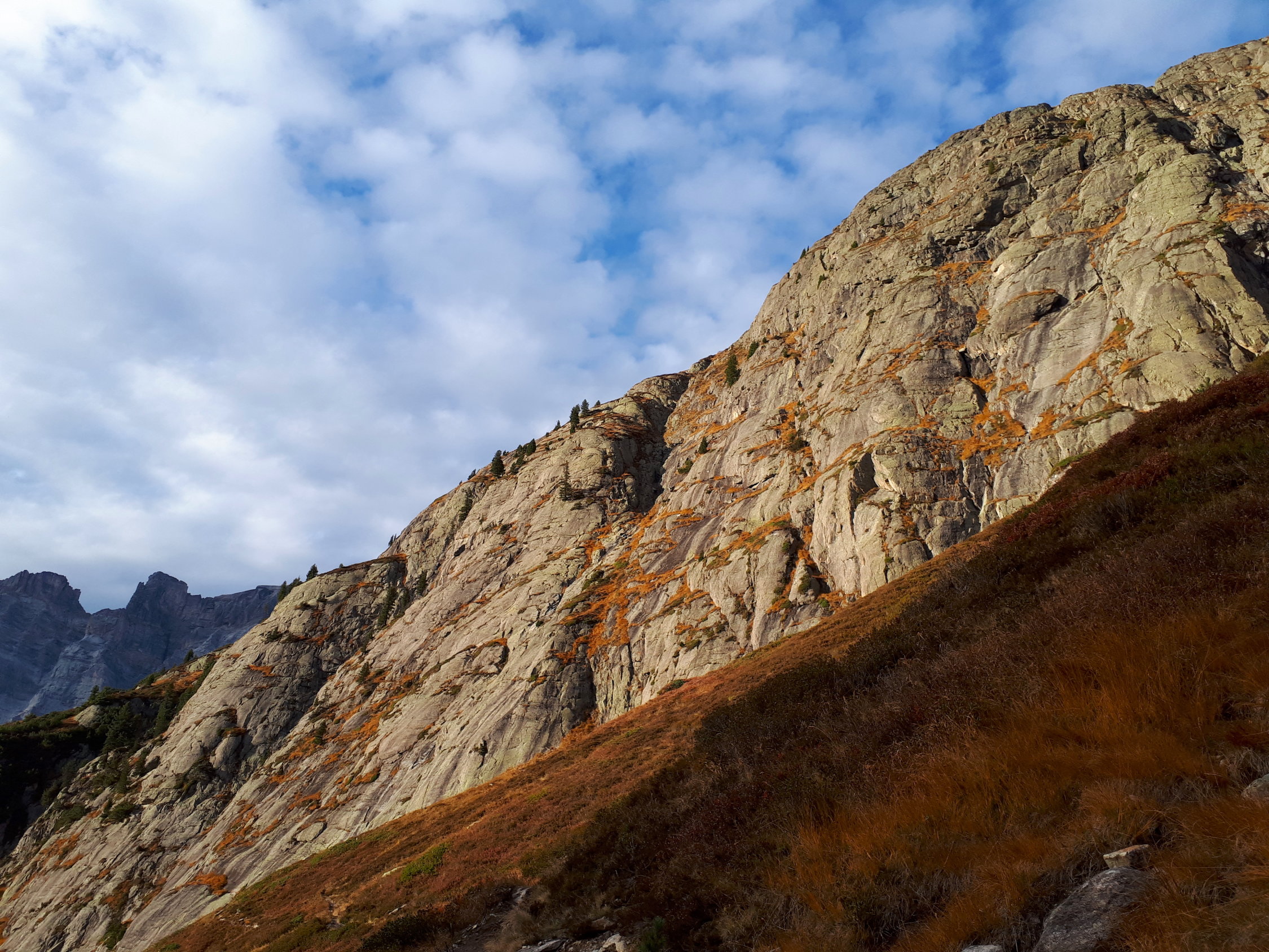 Hier kommen die Liebhaber von einfacheren Mehrseillängen voll auf ihre Rechnung. Durch die aus der Ferne grau und grün schimmernden Plattenrücken führen einige sehr schöne Linien, die allen Genusskletterern gefallen werden. Die geneigten, äusserst soliden Gneisplatten bieten eine erstaunlich vielfältige Kletterei, ohne das all zu viel auf Reibung geklettert wird.