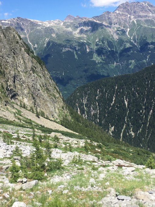 Von Parkplatz 450 m nach alter Barriere auf alter Strasse ins Val Bondasca bis kurz vir Brücke über Bondasca, die es nicht mehr gibt. Nun dem Wanderweg rotweiss markiert folgen steil nach Cugian 1371 m und weiter nach Luvartigh 1553 m. Noch etwa 50 Höhenmeter weiter, bis der blauweiss markierte neue Hüttenweg links Richtung Predacia bei einem kleinen Bach sich auf etwa 1650 m emporschlängelt. Nun fängt die anspruchsvolle Traverse unterhalb Salecina an. Der Weg ist bestens markiert und mit Ketten und Eisen bei steilen Felspartien versehen. Man kann die Route nicht verfehlen, bei Nässe etwas anspruchsvoller. Es geht nun auf und ab in Schroffengelände Richtung Osten, bis man das grosse Triubinasca Becken auf etwa 1800 m erreicht. Nun ist das Gelände wesentlich übersichtlicher, man sieht auch auf der linken Seite die Sasc Furä Hütte 1902 m. Man erreicht den Trubinasca Weg über Blöcke und Wiesen auf Höhe 2180 m. Nun Richtung Nordost und weiter Richtung Süden hinunter zur Hütte.