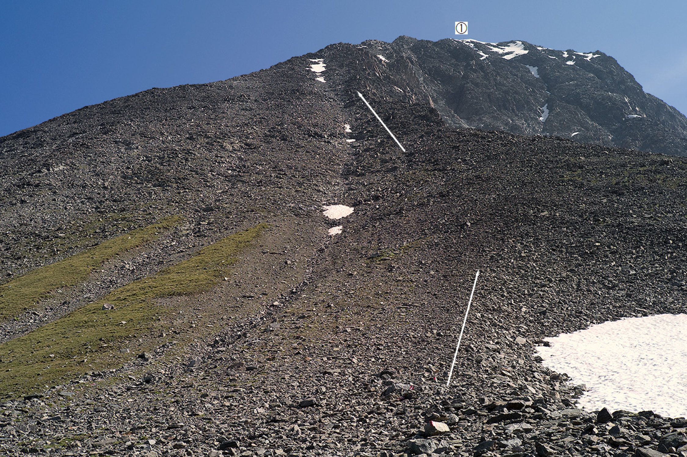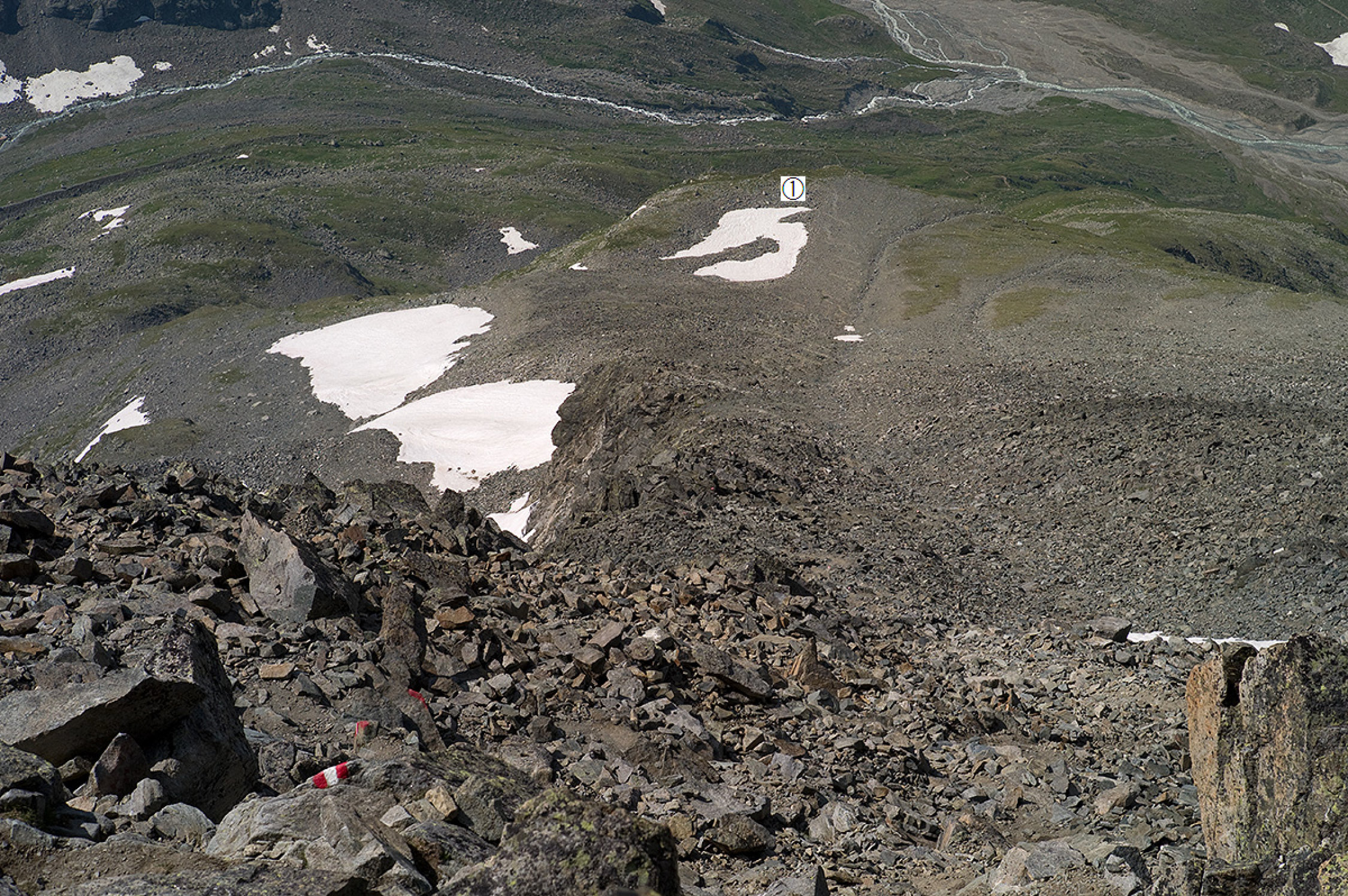 Hier verlässt man die Moräne und steigt dem stellenweise nur schwach ausgeprägten Pfad in nordwestlicher Richtung folgend an einem grossen Steinmann vorbei zum Hohen Egg (2820 m).