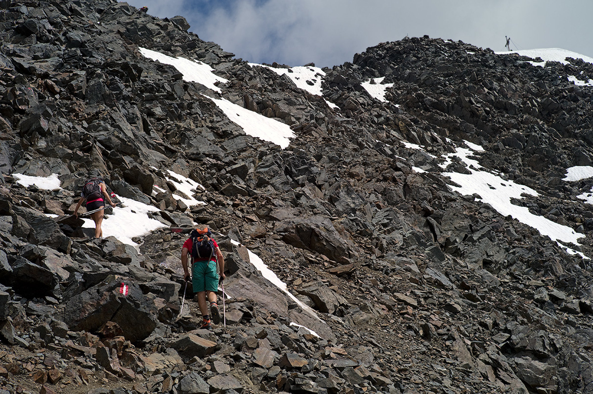 Nun steigt man Begehungsspuren und Markierungen folgend im Geröll über den Rücken des Westgrates empor zum Grat und folgt diesem meist etwas in der Südflanke versetzt bis zum Gipfelkreuz.