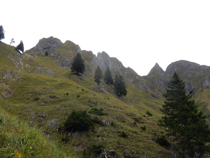 Über "moderat steile" Grashänge (ca. 45°) hinauf zu größerer Fichtengruppe und im Schutz der Bäume empor auf den freien Grasrücken. Bereits deutlich unterhalb des markanten Felsaufschwungs schräg rechts durch die Grasrinne hoch zu einzelner Fichte. Beginn der Schwierigkeiten!