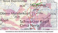 a) Bei sicheren Verhältnissen kann man in Richtung auf das O-Ende dieses Grates aufsteigen und auf einen Rücken hinausqueren. Von dort ist es möglich in die SO-Flanke des Steinpleiss (2716 m) hineinzuqueren, um in den oberen Teil des Stoankarl (Sassi di Plaies) zu gelangen, wo auch vom Val Benair her aufgestiegen werden kann. Dann durch das Stoankarl auf den N-Kamm des Schwarzkopf und durch dessen obere NO-Flanke zum Gipfelplateau des Schwarzkopf.