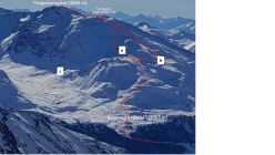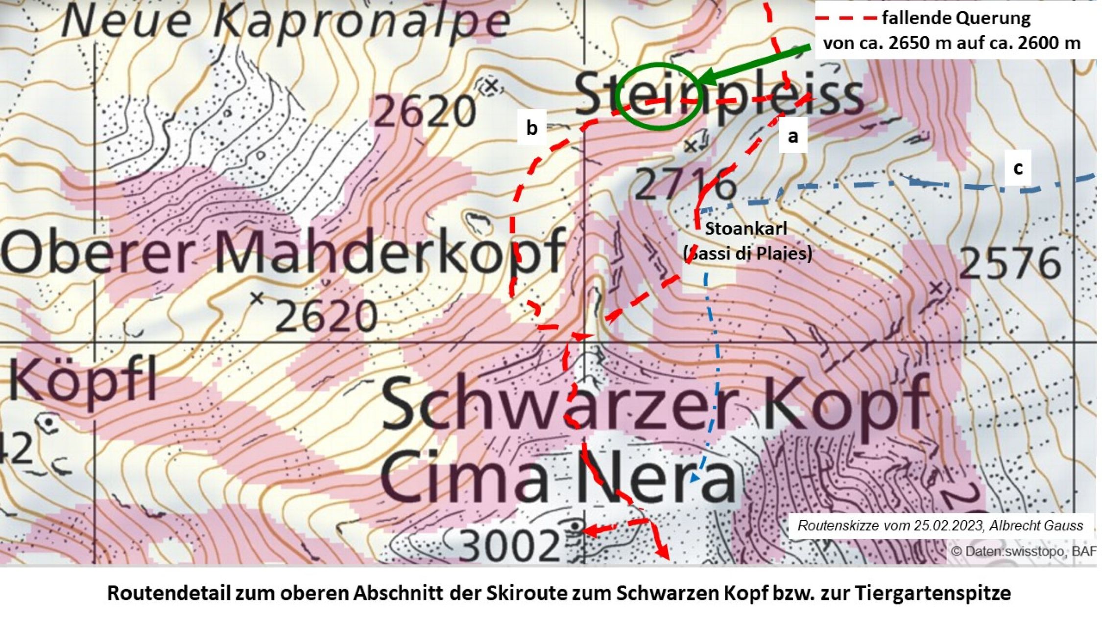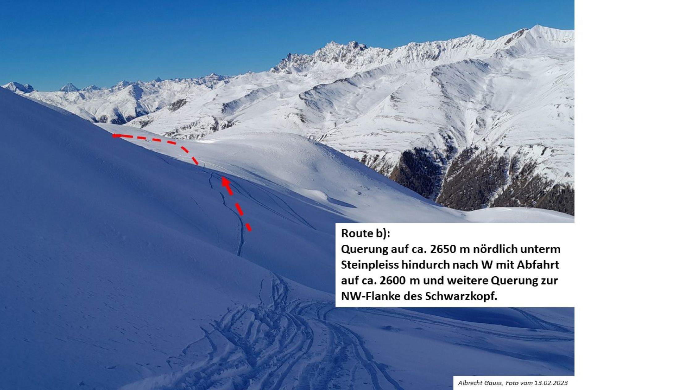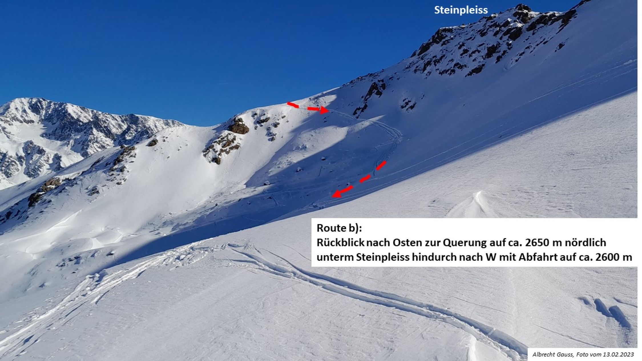 b) Sollte diese Querung zu heikel sein, kann man vom P. 2653 m der LKS bzw. der Tabacoo-Karte ca. 100 m horizontal nach rechts (Westen) queren (also ca. 70 m unterhalb des Felskammes des Steinpleiss (2716 m)) und dann ca. 50 Höhenmeter mit den Fellen Richtung W in eine Mulde abfahren (beim Rückweg für den Gegenanstieg anfellen!).