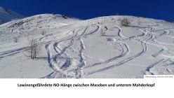 Hinweis zur Lawinengefahr: Auf allen Routen bewegt man sich z. T. über große Abschnitte in >35° steilen N-Hängen bzw. NW- oder NO-Flanken, weshalb bei entsprechender Lawinengefahr von einer Begehung abzuraten ist (s. u. Fotos von Lawinenabgängen unterhalb vom Unterem Mahderkopf und vom Lawinenunfall im Stoankarl vom 02.04.2023).