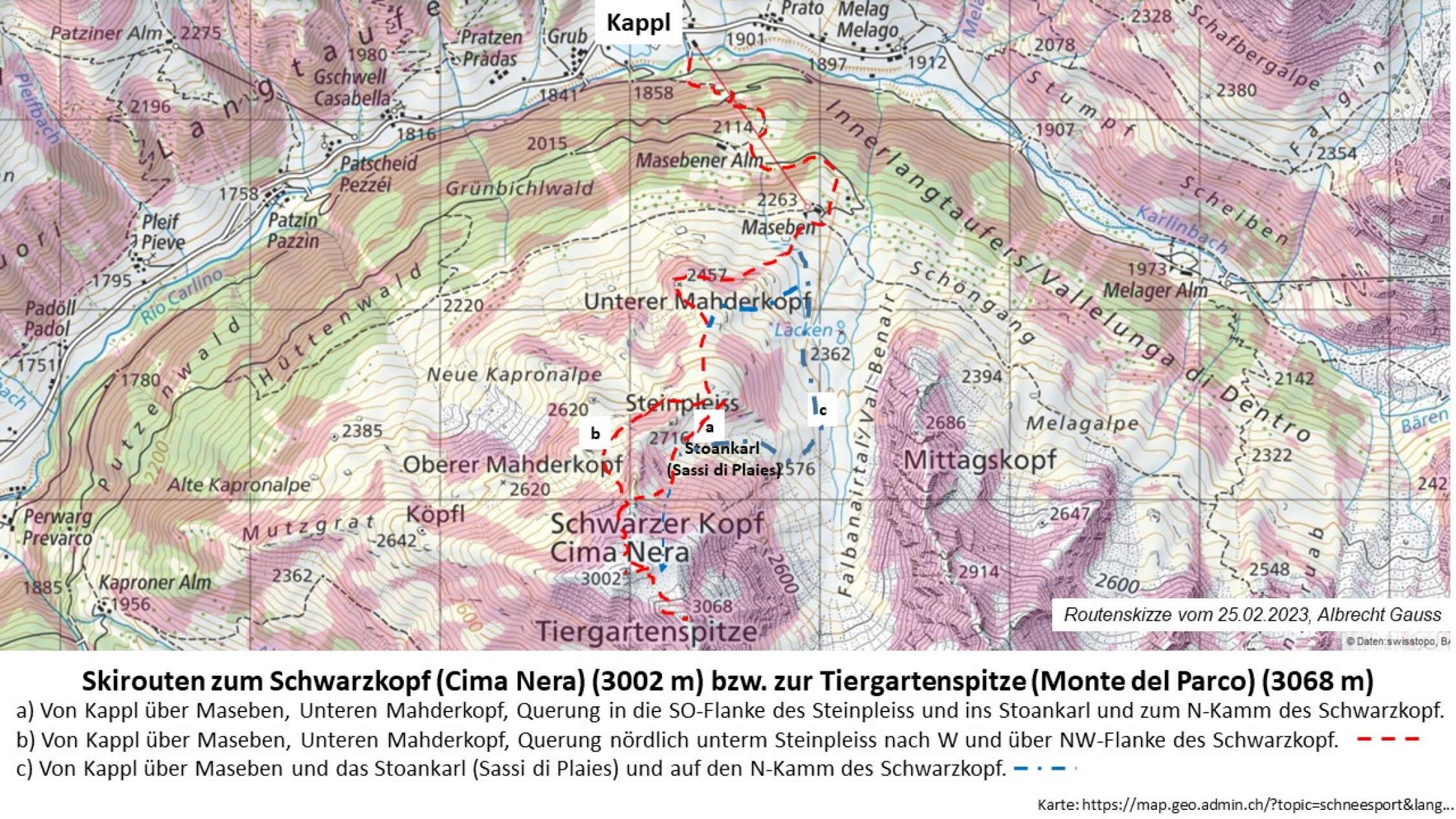 a) Von Kappl über Maseben und den Unteren Mahderkopf, dann Querung auf ca. 2650 m in die SO- bzw. S-Flanke des Steinpleiss und ins Stoankarl (Sassi di Plaies) und durch das Stoankarl auf den N-Kamm des Schwarzkopf.