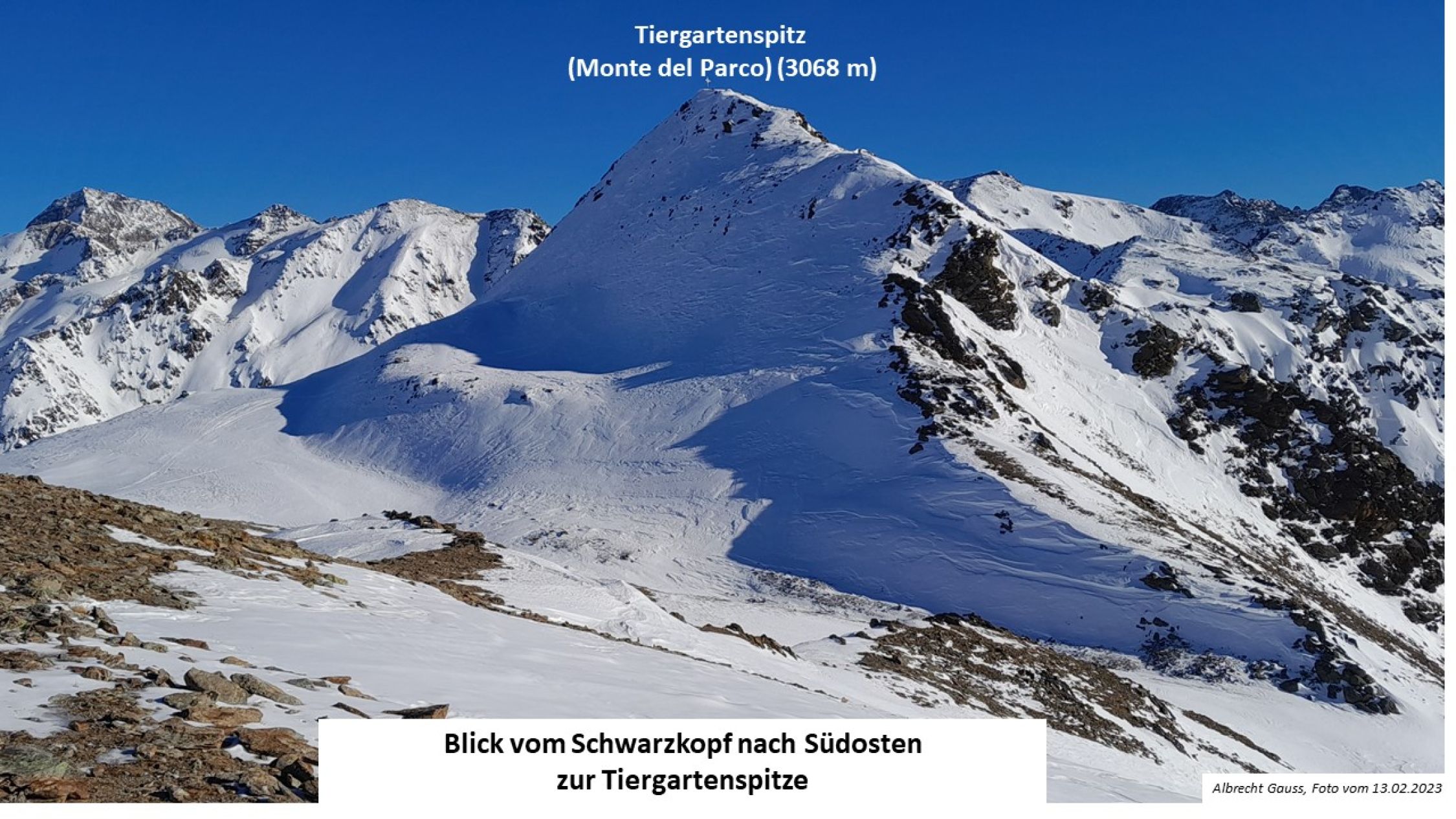 Über einen kurzen Nordhang in eine Mulde vor dem Schwarzkopf und vollends zum Steinmann vom Schwarzkopf (3002 m) hinauf. Vom Schwarzkopf nach Südosten wenige Meter abwärts in eine Senke bzw. ein Plateau vor dem Gipfelaufbau der Tiergartenspitze. Kurz in steilen Serpentinen rechts haltend auf den NW-Kamm hinauf und je nach Schneeverhältnissen zu Fuß oder ggf. mit Ski zum Gipfelkreuz der Tiergartenspitz (3068 m).