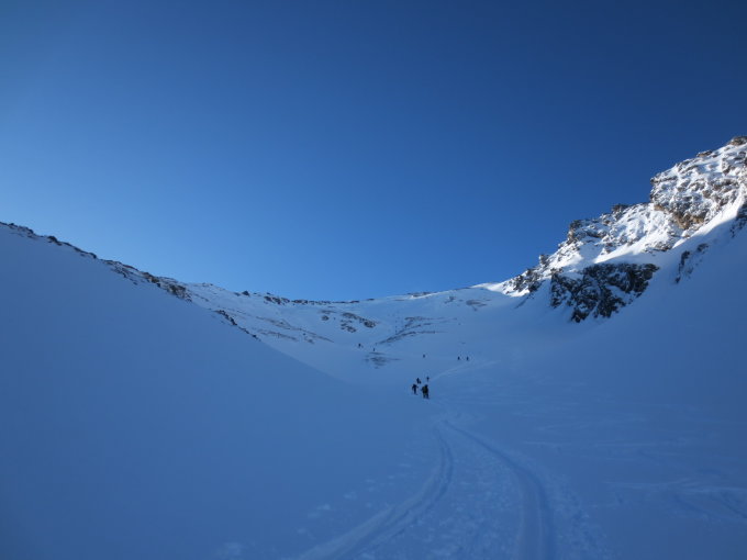Bester Pulverschnee in der Abfahrt. Obwohl die N-O-seitigen Schattenhänge durch viele Tourengeher schon gut zerpflügt waren, gab es noch genügend Möglichkeiten, eigene Spuren zu legen. Unten allerdings pistenähnliche Verhältnisse.