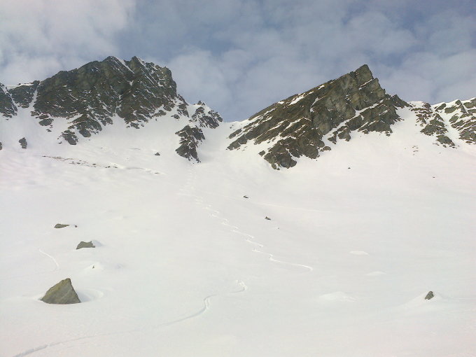 Kleiner Parkplatz an der Bushaltestellen vom Sarotlamaisäss 1270m. Der kleinen Straße entlang bis der Wanderweg schräg zum Bach führt. Hier immer rechts vom Bach aufwärts, eine Passage durch den Wald, bis zu Sarotlaalpe 1822m. Hier weiter rechts vom Bach halten zu den oberen Hängen. In einem leichten Rechsbogen auf die Rinnen zwischen dem Gipfel und Nebengipfel 2550 zuhalten. Diese hinauf, oben bis zu 40°. Am Sattel Skidepot oder wenn möglich mit Ski die letzten 40Hm zum Gipfel.
