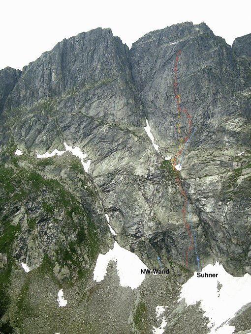 Zustieg wie bei der NW Wand nur ca 50 Meter weiter rechts auf einem kleuinen Vorbau bei grosser angelehnter Schuppe. Abseilstand. Vorbau rechts umgehen.