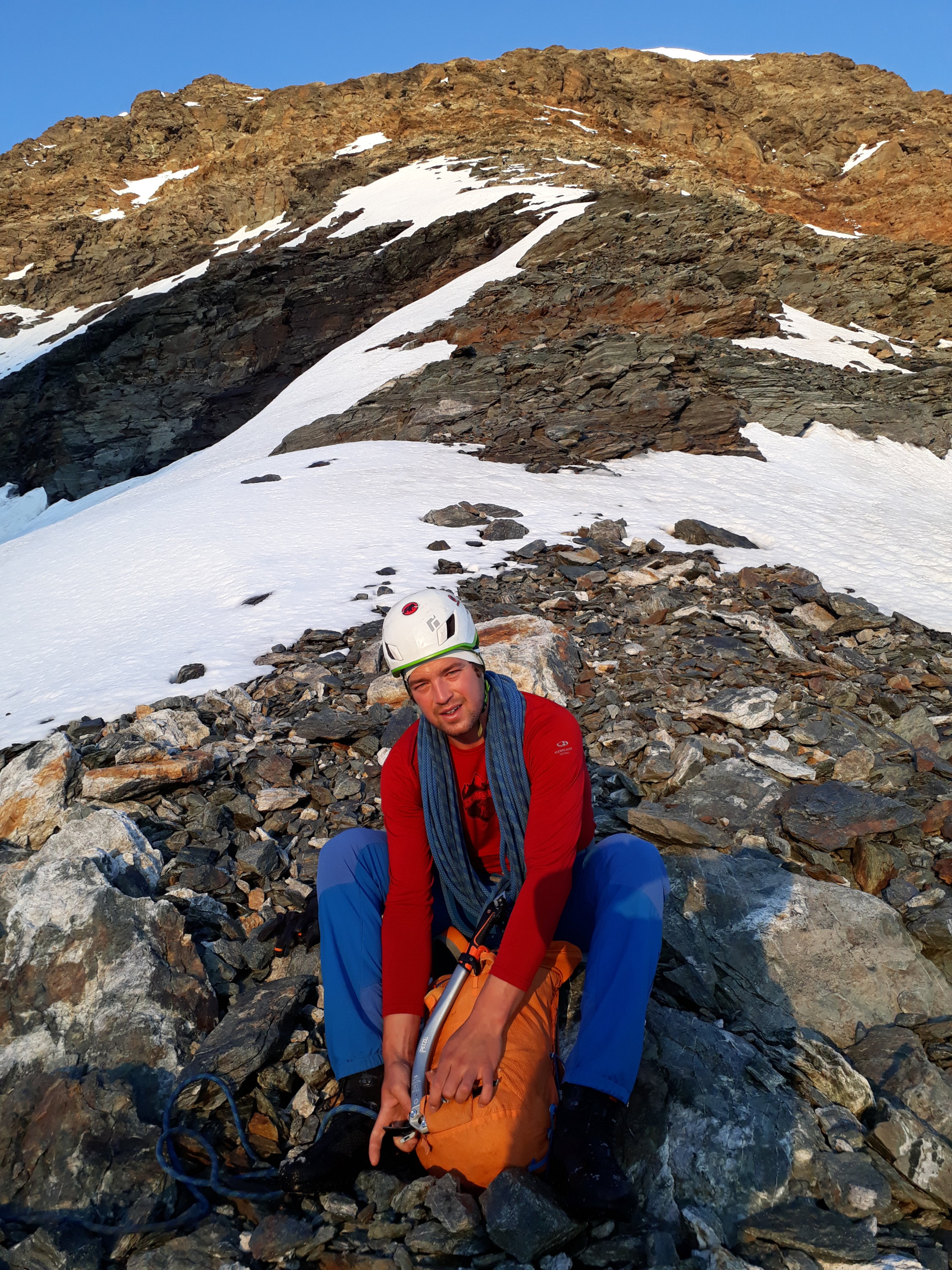 Der ENE-Grat ist wenig ausgeprägt. Zuerst besteht er aus geneigten Schnee/Eisfeldern, dann aus gut gestuften Felsbändern (II). Der knapp 100 m hohe Schlusshang wiederumg besteht bis spät in die Saison aus Firn. Dann ist dieser Weg auch gut als Abstieg geeignet.