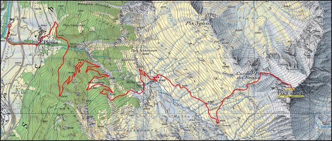 Von der Bushaltestelle Pignia Bogn (955m) dem Wanderweg entlang hinauf ins Dorf Pignia (1054m). Bei der Kirche dem Fahtsträsschen hinauf, so dort der Wegweiser zeigt "Bavugls 2½h" an. Bei der Brücke über den Bergbach (P.1183m) gibt es zwei gleich lange Möglichkeiten, entweder folgt man nun dem Wanderweg oder weiter dem Strässchen hinauf zum Maiensäss Bavugls (1940m). Von den Alphütten Bavugls folgt man weiter dem Strässchen, der nun auch Wanderweg ist, zuerst in Kehren, dann fast flach taleinwärts zur Alp Neaza (2229m). Hier zweigt ein übles Fahrsträsschen nordwärts steil ab. Man begeht es bis zu dessen Ende bei einer Bachquerung (2298m). Nun wedet nach sich nach Nordosten und steigt weglos über Alpweiden, später spärlicher bewachsenen Hänge hinauf in zirka 2670m hohen Sattel zwischen Piz Curver und Pintg da Neaza (2720,8m) auf. Zuletzt führen knapp östlich der Lücke Wegspuren auf den Grat. Von dort ist durchaus ein Pfad über den Nordwestgrat zum Gipfel vorhanden.