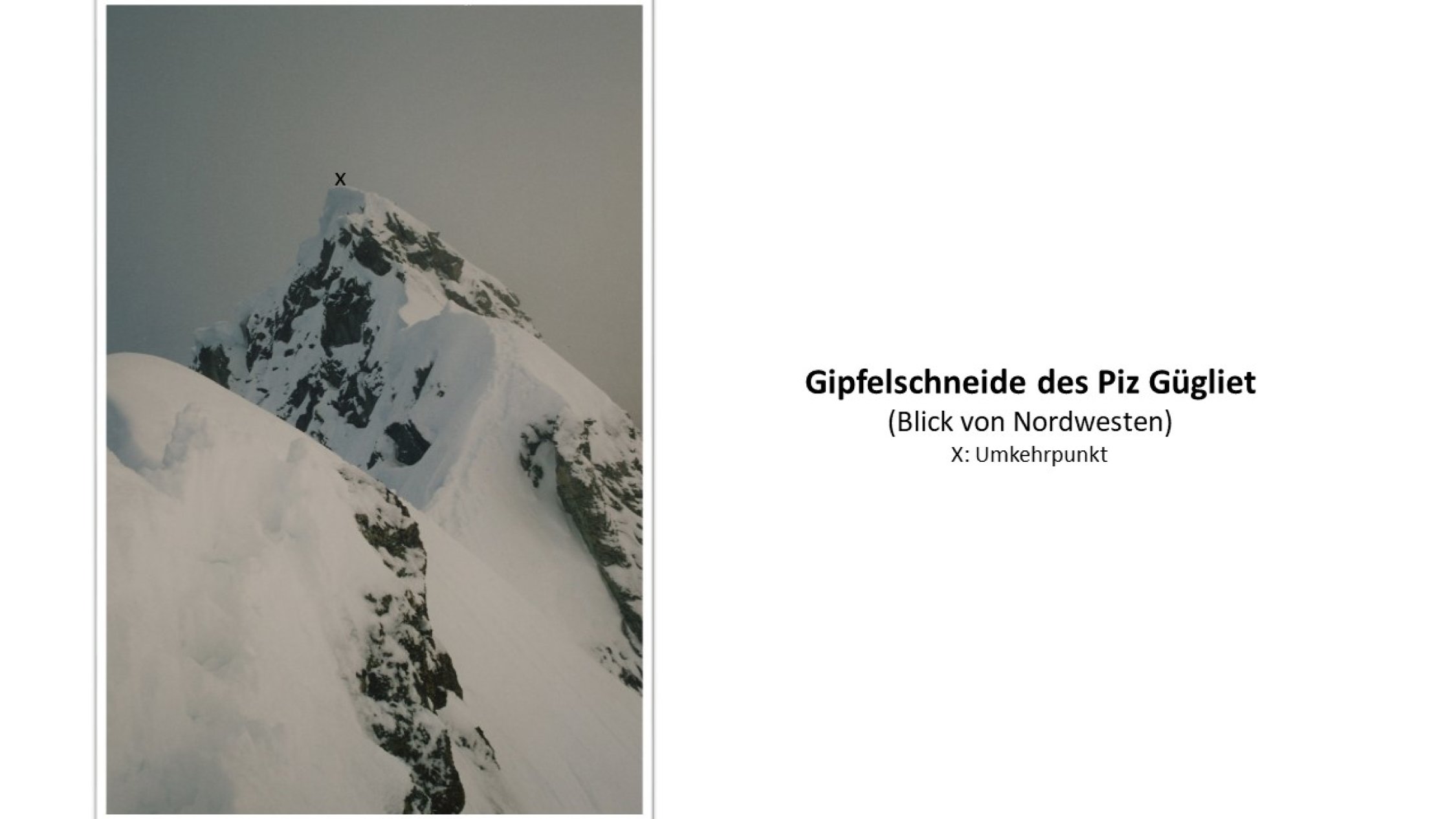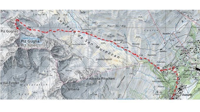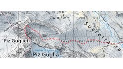 Von Champfèr (Haltestelle Guardalej) auf der Straße Richtung St. Moritz Dorf zum P. 1825 m in der Dorfmitte und nach knapp 100 m schräg links die Fahrstraße aufwärts und später auf der „Privatstraße“ anfangs zu Fuß (Ski tragend) zum Beginn des Val Suvretta da San Murezzan. Etwa dem Sommerweg entlang unterhalb der Alp Suvretta vorbei bis nach Chaschigna (2310 m). Dort über den Bach (Ova da Suvretta) und auf z. T. vorhandenen Spuren die zunehmend steiler werdende O-Flanke in Kehren bis auf das Plateau bei ca. 2765 m (nördlich vom P. 2883 m). Ab hier in unberührtem Gelände nach Nordwesten aufwärts, in Richtung eines Couloirs, das wenig südlich vom P. 3043 m in eine kleine Gratscharte im N-Grat zwischen P. 3043 m und dem Gipfel des Piz Gügliet hinaufzieht. Skidepot am Beginn des Couloirs (ca. 3010 m). Das mit steilen Felsplatten gespickte und somit recht abschüssige Couloir mühsam hinauf und zuerst auf den P. 3043 m. Dann zurück zur Gratscharte und jenseits (wegen des stark überschneiten Grates) wenige steile Meter nach Westen hinab, um wieder schräg links aufwärts steigend auf den N-Grat oberhalb der Gratscharte zu gelangen. Über den im oberen Teil recht verwächteten N-Grat letztlich auf die höchste Gratschneide.