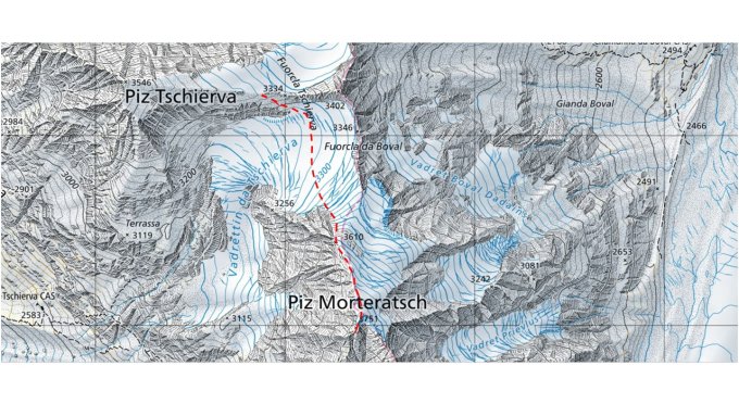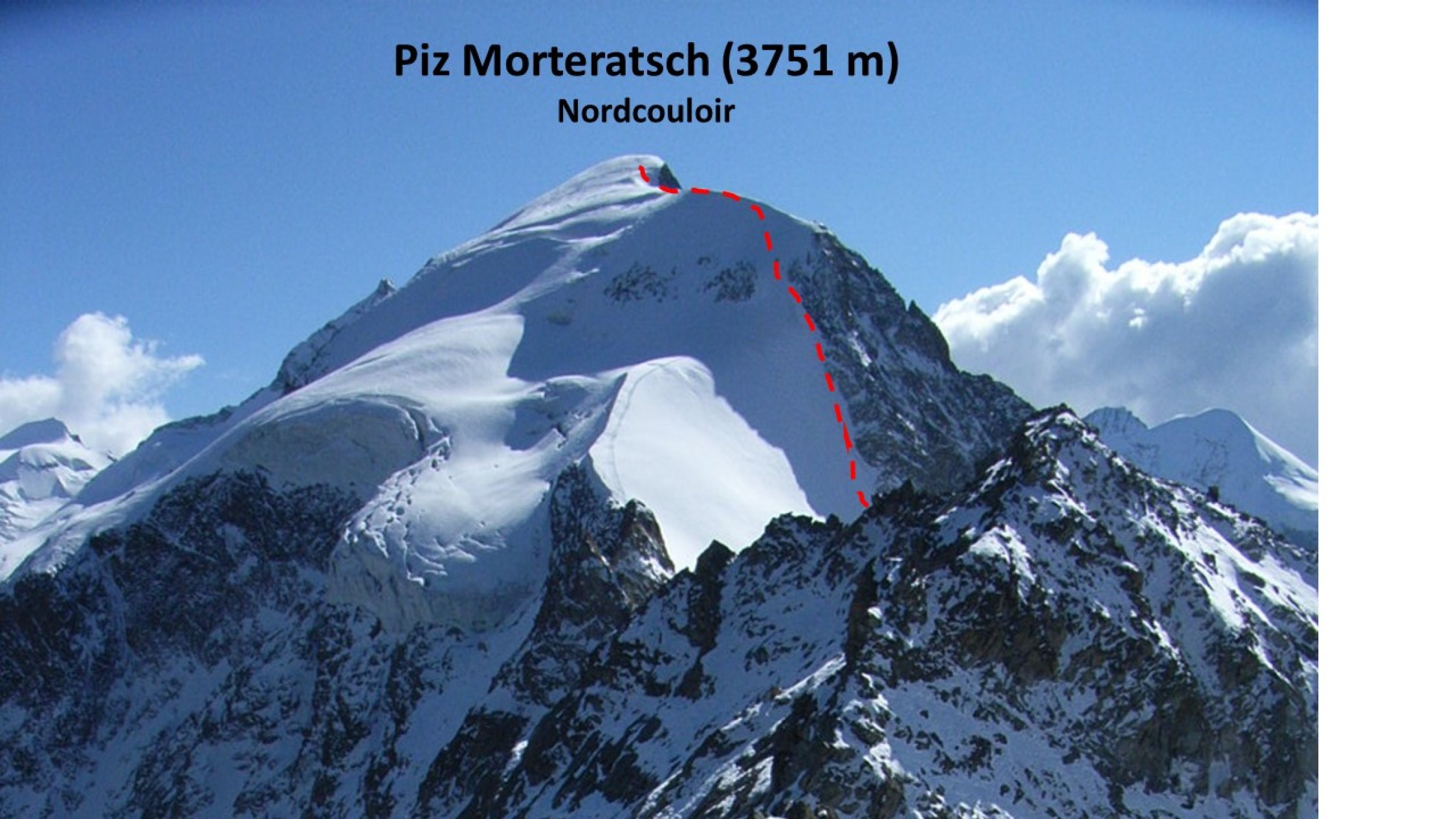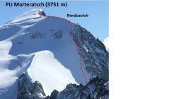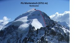 Von der Fuorcla Tschierva (3334 m) oder der Fuorcla Boval (3346 m) auf den Vadrettin da Tschierva auf 3300 m hinab, dann Richtung Süden den Gletscher queren und an den Fuß des N-Couloirs (ca. 3350 m), das östlich des NNW-Spons hinaufzieht. In gerader Linie (bis ca. 50° steil) bis zum P. 3611 m hinauf. Bei Seil-Sicherung ca. 6–8 Seillängen. Von dort weiter direkt über den Nordgrat zum Gipfel.