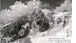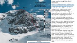 Rechts (W) des großen Eisabbruchs im unteren Wanddrittel ziemlich direkt über die 1. Randkluft, dann oberhalb dieses Abbruchs über den Hängegletscher aufwärts und über eine 2. Randkluft hinweg. Weiter gerade aufwärts in Richtung einer Eiszunge, über die man in ein Eiscouloir gelangt, das in das rechte (westliche) Ende des Quergangs der Route der Erstbegeher mündet (s. Routenskizze auf dem Foto). Durch dieses Couloir hinauf (Stellen 65°, rezidivierend blanke Passagen, z. T. auch sehr dünne Firn-, Eisauflage auf plattigem Fels). Am Ende des Couloirs zwar steiler, aber bei Firn relativ einfacher Quergang nach rechts auf die oberste Eisflanke. Über diese Eisflanke die letzten 350 Höhenmeter (Hm) gerade hinauf und über eine Wechte (60°) auf den NW-Grat. Über diesen noch wenige Hm zum Gipfel.