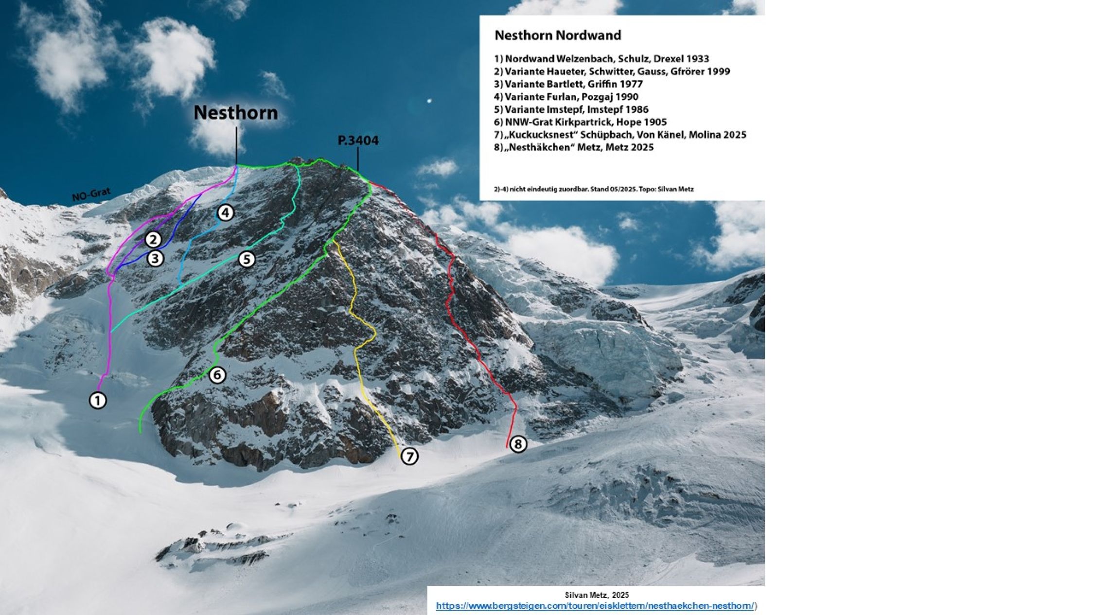 • Route „Kuckucksnest“. Erstbegeher: Silvan Schüpbach, Peter von Känel, Carlos Molina, 20.02.2025. Details s.: Fotos und https://www.bergsteigen.com/touren/eisklettern/kuckucksnest-nesthorn-nordwestpfeiler/ und https://www.bergsteigen.com/news/neuigkeiten/kuckucksnest-nesthorn-nordwestpfeiler/