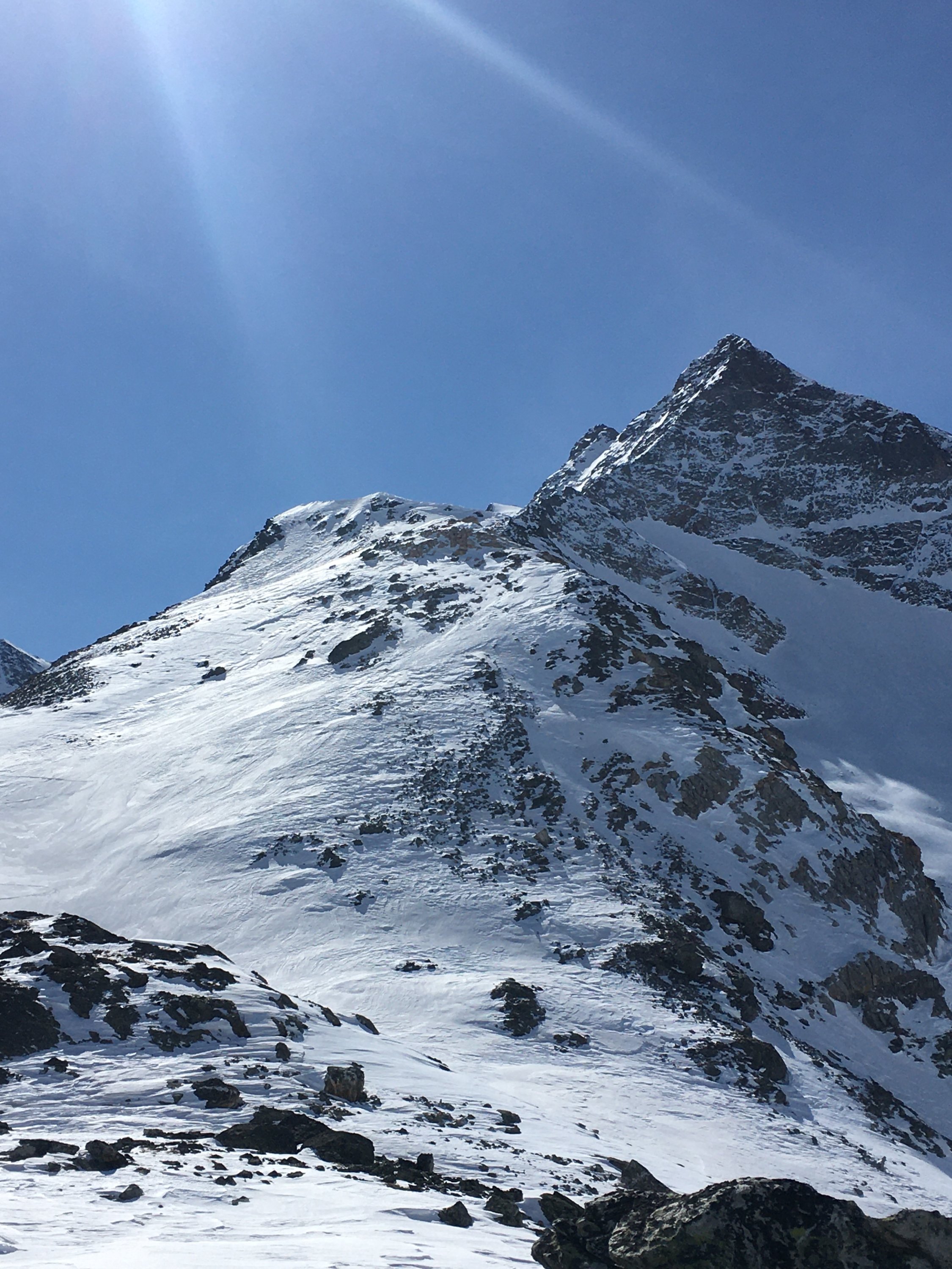 Skitourenausrüstung inkl. Harscheisen, je nach Verhältnisse Pickel oder Steigeisen für Gipfelgrat.