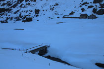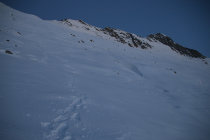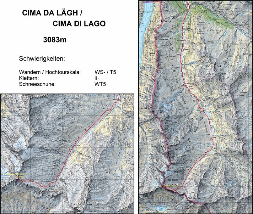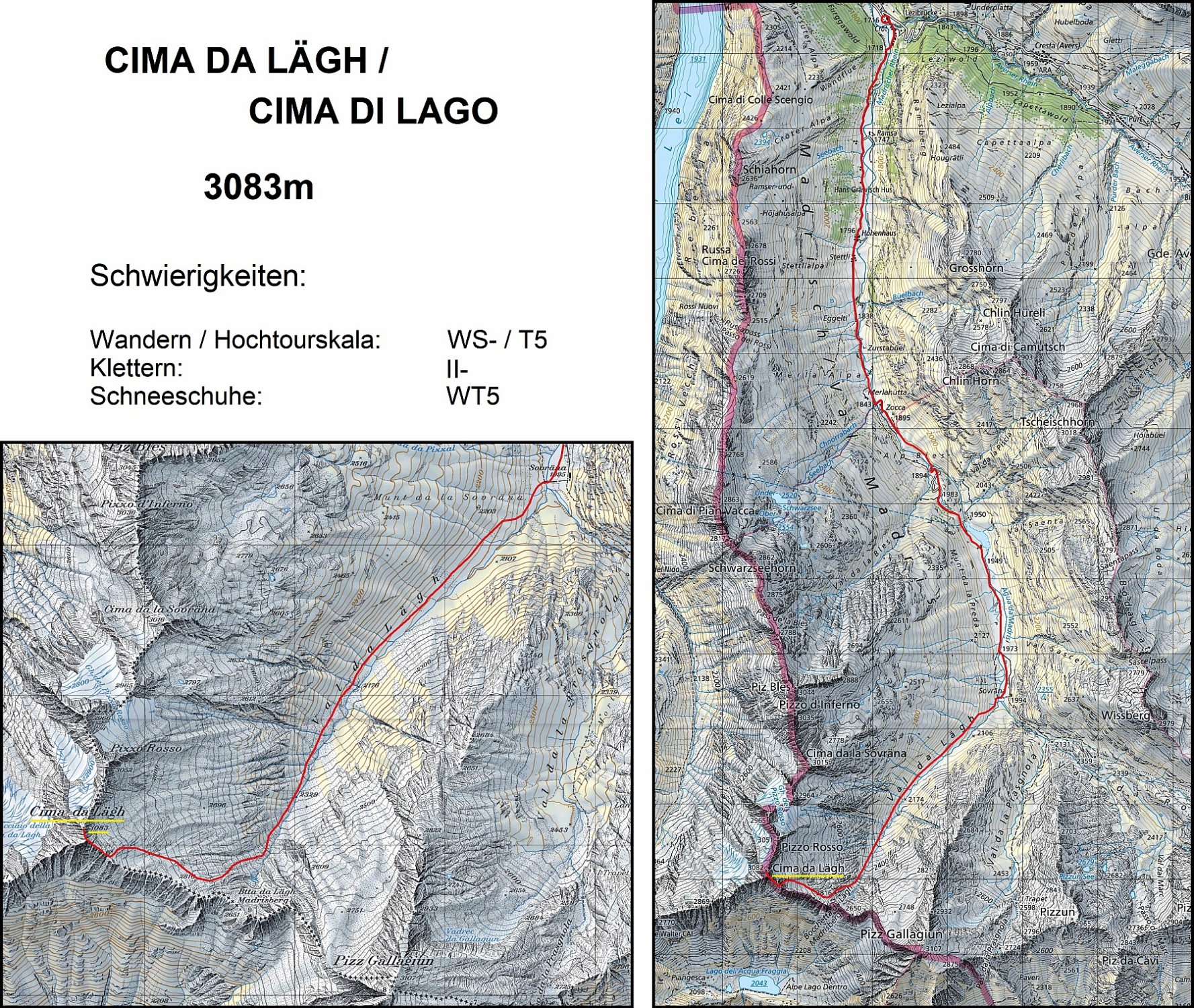 Von der Postautohaltestelle in Cröt (1715m) durch das Dorf und dann in Südrichtung auf dem Fahrsträsschen 3½km ins Madrischtal / Val Madris hinein zum Höjahus (1800m). Bis hierher ober wenig weiter bis Stettli (1797m) auch im Winter meistens mit dem Auto möglich, Parkplätze vorhanden. Von Stettli weitere 2km bis zur Merlahütta (1843m) wo der Madrischer Rhein auf einer Brücke überquert wird. Nun auf der Ostseite des Baches 1½km zur Alp Bles (1887m) wo man den Bach wieder über eine Brücke überquert. Nun znächst etwas steiler westlich an der Kuppe P.1983m vorbei zum kleinen Stausee von Preda (1951m) und weiter zur Brücke P.1973 wo erneut der Bach nach Osten überquert wird, zuletzt südwärts zu den Alphütten Sovräna (1995m). Von der Alp Bles bis Sovräna 4km. Bei Sovräna überquert man auf einer kleinen Steinbrücke nochmals den Bach und wendet sich dann nach Südosten ins Val da Lägh. Nun zunächst rechts des Baches ins Tal hinein und diesem bis zirka 2520m folgen, zuletzt über eine zirka 100 Höhenmeter hohe Steilstufe bis 30° Neigung. Nun wendet man sich nach Westen wo das Gelände bald wieder vorübergehend flacher wird und peilt den felsigen Nordostgrat an den man auf 2970m unter den Felsen erreicht, die letzten hundert Höhenmeter sind wiederum 30° steil. Schneeschuhdepot bei den Felsen. Der erste Felsturm wird frontal über eine Rampe erklettert (II), der folgende auf der Ostseite (Fixseil; II-), der Dritte über Stufen auf der Westseite umgangen (I) und der letzte wieder auf der Ostseite meist durch steilen Firn. Nun wird der Grat flacher und schmaler (Achtung Wechten) bis zu den Gipfelfelsen die unschwierig (I) erklettert werden.