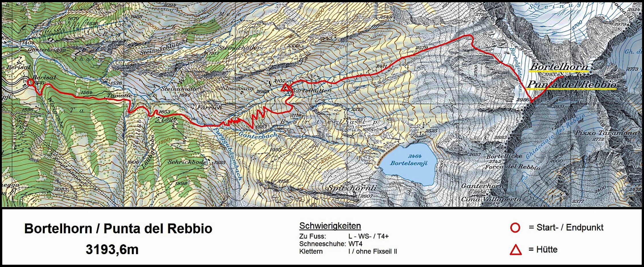 Von Berisal (1525m) an der Simplonpassstrasse Waldweg entlang Richtung Osten über Tamatte und Löüb bis nach Färrich wo sich Ganter- und Furggubäumbach vereinigen. Dann in etwa dem Hüttenweg folgend über den Steilhang nördlich des Ganterbachs (bis zirka 40° steil, im Frühling relativ früh aper) zu den Bortelhütten (2107m). Weiter Richtung Osten über weitläufiges Gelände via P.2411m und P.2579m bis zum Nordwestende des Bortelgletschers. Über den Gletscher Richtung Südosten zur Lücke im Südwestgrat bei P.2986m (zuletzt bis zirka 35°). In der Lücke Schneeschuhdepot. Zu Fuss steigt man nun den Südwestgrat hoch, Pickel und Steigeisen sind meistens zwingend, ein Seil fakultativ. Schwierigkeiten umgeht man auf der Südseite des Grats. Eine kurze Kletterstelle (II) unterhalb des Vorgipfels mit dem Kreuz ist mit einem Fixseil gesichert. Vom Kreuz gelangt man nahezu waagrecht in wenigen Minuten zum höchsten Punkt.