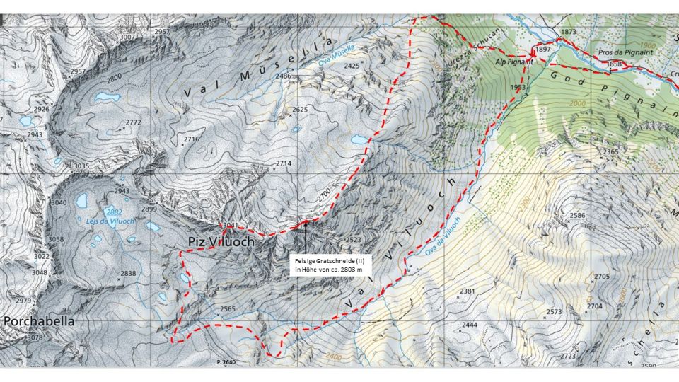 Alternativ kann die o. g. "Schlüsselstelle" in der NO-Flanke umgehen, in dem man schon vom See aus (2570 m) in der NO-Flanke aufsteigt oder auf ca. 2720 m in diese Flanke quert und den Grat dann (wieder) in der Gegend vom P. 2855 m erreicht, von wo der weitere Anstieg leicht ist (s. a. die Beschreibung von "Bergrider": https://www.gipfelbuch.ch/verhaeltnisse/738353-hochtour-piz-viluoch-3042m bzw. https://www.gipfelbuch.ch/routen/33564--traverse-vom-piz-viluoch-zum-piz-porchabella).