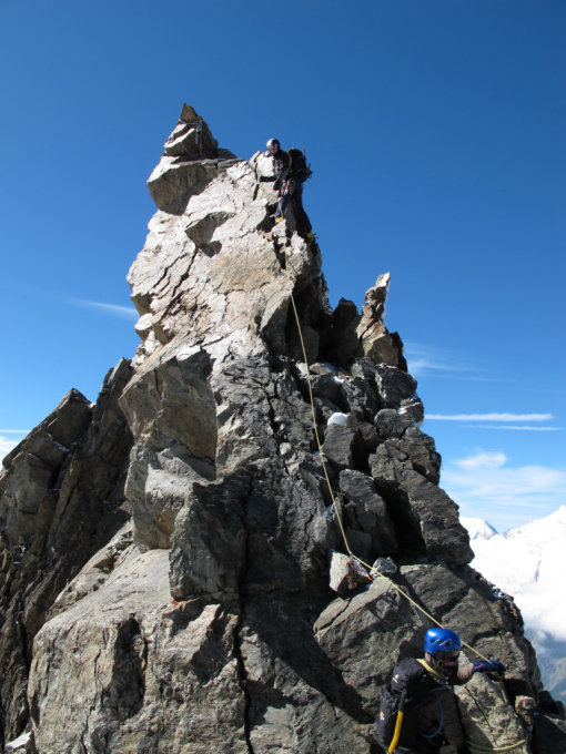 --> Route kann in "SAC Walliser Alpen" unter R569 nachgelesen werden. Wir konnten sehr fix klettern und haben nie abgeseilt. Beim ersten Gendarm sicher eine Option, Gendarm 2+3 m. E. bei genügend Sicherheit/Vertrauen nicht unbedingt nötig. Achtung loser grosser Stein zum Stehen gerade bei den letzten Klettermetern unter dem Kreuz.