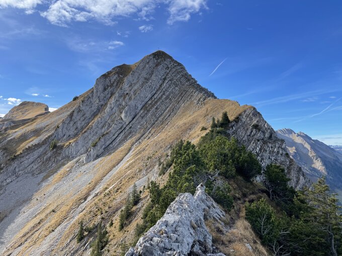 Nun dem Grat folgen zu Pkt 1940 meist unmittelbar auf oder neben dem Grat teils Wegspuren. 2-3 etwas ausgesetzte Stellen und ein wenig kraxeln.