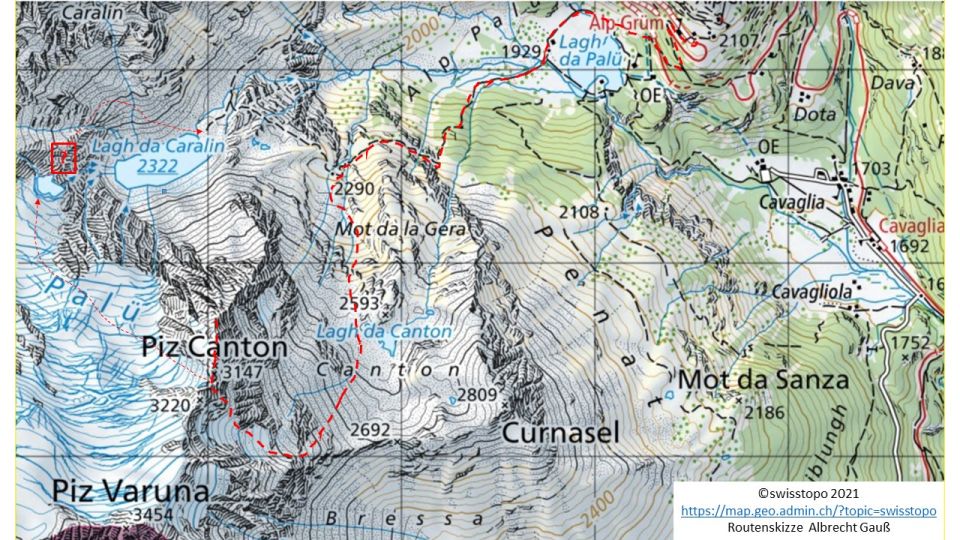 Wegen eines Erdrutsches im August 2023 war der südliche Wanderweg vom Lagh da Palü zum Lagh da Caralin vorübergehend gesperrt. Laut aktueller digitaler Landeskarte (https://map.geo.admin.ch, Optionen "Wanderwege" und "Sperrungen Wanderwege" anklicken; Zugriff 03.08.2025) gibt es eine neue Wegführung. Der neue Weg führt vom SW-Ende des Lagh da Palü unterhalb von Laras da Palü anfangs kurz Richtung SSW im Wald aufwärts, verläuft dann durch zwei Wiesenabschnitte nach W und steigt im weiteren Verlauf wieder im Wald Richtung WSW an, um bei ca. 2055 m in den alten Weg zu münden (s. letzte Kartenskizze in den Bildern). Weiter in Richtung Lagh da Caralin bis zum P. 2291 m, wo der Wanderweg zum Lagh da Caralin nach links in Richtung S ins Val da Canton verlassen wird. Jetzt weglos die beiden östlichen Bäche bei ca. 2370 m in südöstlicher Richtung überschreiten und die kleinen Felsabbrüche rechts (westlich) liegen lassen auf die Ebene beim Mot da la Gera hinauf, wobei das Ziel ist, etwas westlich vom höchsten Punkt 2593 m und ca. 150 m westlich vom Lagh dal Cantun anzukommen. Von der Hochfläche wenige Meter Richtung W auf ein Blockfeld hinab und dann jenseits westlich den O-Hang des Piz Canton schräg nach S hinauf, wobei man immer wieder Rasenschrofen nutzen und unangenehmes Geröll vermeiden kann. Dabei umgeht man die Felsabbruchzone oberhalb von ca. 2630 m und oberhalb von 2760 m jeweils südlich und südlich von dem Bach, der von den Gletscherresten des Vadret da Canton herabfließt. Die bei diesem Anstieg südöstlich liegende Bocchetta da Canton (2692 m) wird nicht berührt, da man ca. 100 m nördlich des Grates aufsteigt, der von der Bocchetta sich in Richtung O-Flanke des Piz Varuna hinaufzieht. Ab ca. 2840 m wendet man sich nach rechts (W bzw. WNW) und erreicht so das anfangs recht flache Restfirnfeld des Vadret da Canton. Schräg rechts ansteigend über das Firnfeld bis an den Fuß (ca. 2980 m) des unteren Felspfeilers des OSO-Grates des P. 3220 m. Von dort je nach jahreszeitlicher Ausaperung z. T. über Blöcke, Gletscherreste oder Schnee aufwärts bis man nach rechts (N) auf den flachen Absatz des OSO-Grates des P. 3220 m in einer Höhe von ca. 3050 m ausqueren kann. Nun über den OSO-Grat auf Pfadspuren aufwärts (mehrere Steinmännchen) bis man in einer Höhe von ca. 3150 m horizontal nach rechts (N) in eine kleine Scharte queren kann, die nordöstlich vom P. 3220 m bzw. direkt südlich des P. 3147 m im den Piz Canton und Piz Varuna verbindenden N-Grat liegt. Von der o.g. Scharte auf dem N-Grat des Piz Varuna bzw. S-Grat des Piz Canton in ca. 10–15 min ganz leicht fast immer auf dem Grat bleibend Richtung N, dabei den P. 3147 m überschreiten, mit etwas Höhenverlust zum Gipfel des Piz Canton (3110 m) (größerer Steinmann mit Stange). 4 ½ h von Alp Grüm inkl. Pausen, ca. 1200 Höhenmeter. Anschließend weiter zum Piz Varuna (3454 m) (s. Gipfelbuch.ch/Tourenführer/Piz Varuna über O-/SO-Flanke).