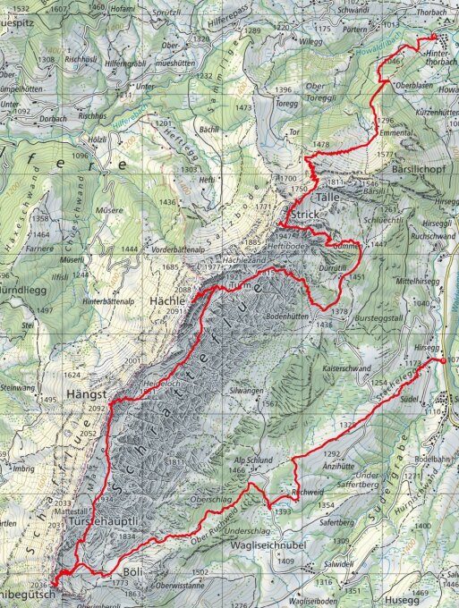 Start beim Skilift Torbach (grosser Parkplatz) - Aufstieg über die rote Piste und weiter durchs Ämmetal zum recht steilen nördlich vom Tälle - über die Ober Gummenegg zur Lücke im Felsriegel (Fussaufstieg) - in wenigen Minuten zum Strick - Abfahrt über den Ostrücken bis Under Gumme - Traverse zur Hächle-Normalroute und ihr folgend zum Gipfel - abfahren und traversieren dem Hächle-Ostabbruch entlang - idealerweise erreicht man ohne Felle die Nordroute zum Hengst und folgt ihr bis zum Gipfel - mit Fellen südwärts queren ohne grossen Höhenverlust und weiter ungefähr dem unteren Sommerweg entlang bis Mattestall - abrutschen in den Kessel nördlich vom Schibengütsch und über die Normalroute zum Gipfel - Schlussabfahrt zur Hirsegg