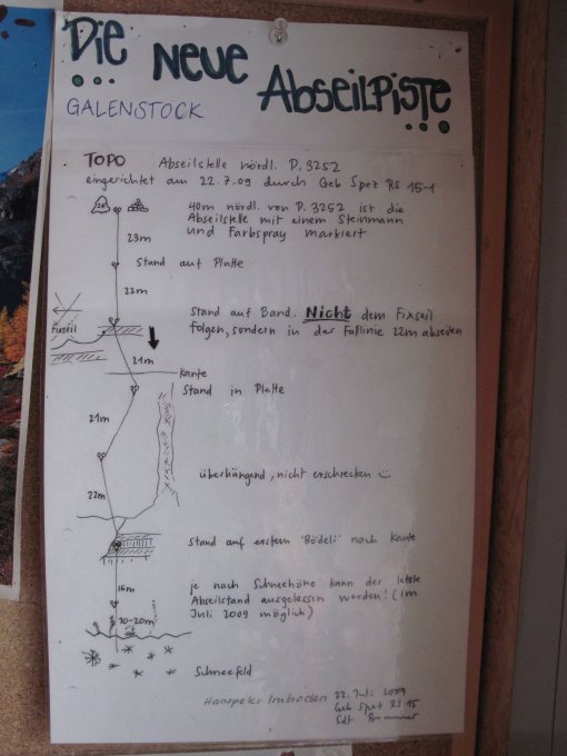 7 Mal abseilen mit 50m Seil. Mit Doppelseil entsprechend weniger. Letzter Stand kann je nach Schneehöhe ausgelassen werden (Achtungj: mögliche tiefe Randspalte beachten)