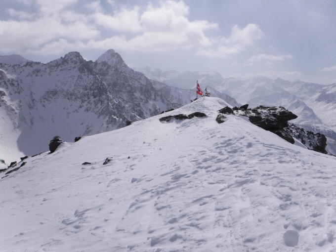 Beim Melaghof direkt an nördlicher Seite vom Parkplatz schnallt man sein Laufgeräte an. Meist auf gewalzter Piste steigt man nordwärts unsteil zum Hochbehälter und über einen Zaun rechts an diesem vorbei zur oberen Umlenkrolle ehemaligen Schlepplifts südöstlich der dammartigen Lawinenverbauung unterhalb des tief eingeschnittenen Tobels Inner Vallatsch. Vor der Umlenkrolle kehrt man nach rechts und folgt einem breiten Feldweg (Sommerweg Nr. 1) in östliche Richtung hinauf zum Wegekreuz „Auf Melag“ (P 2119), wo es eine Sitzbank gibt mit Blick auf das Tal hinab und zur Langlauf-Loipe entlang des Karlinbaches östlich von Melag. Über flachen Boden quert man nach Nordosten drehend zum Tobel des Melagbaches hin. Oberhalb der Brücke über den Bach, wo der Feldweg endet und als Wanderweg Nr. 1A Weißkugelhütte führt, läuft man taleinwärts unsteil bergauf. Um ggfs. der Lawinengefahr von östlichem Hang der Schöneben auszuweichen, wechselt man die Bachseite an geeigneter Stelle. Nach ca. 200 m kann man wieder auf linke Bachseite (in Aufstiegsrichtung gesehen) wechseln. Nach 45 trifft man auf einen Wegweiser bei der Brücke über den Melag-Bach (P 2235), wo nach rechts nächster Sommerweg zur Weißkugelhütte (Höhenweg) abzweigt. Unterwegs passiert man 2 kleine Wasserschächte an rechter Bachseite. Nach ca. 300 m biegt man bei einem großen Felsbrocken nach rechts hangaufwärts ab und verlässt rot-weiß signalisierten Sommerweg Nr. 1, der zum Weißsee-Joch führt. Über bis zu 33° steilen, gestuften Hang beginnt nordwestwärts der Aufstieg etwas links drehend ins Schönkar. Man läuft jedoch noch ca. 300 m weiter zu einem kleinen Felsenbereich, unter dem von rechts und links 2 Bäche zusammentreffen (ca. 2350 m). Dort überschreitet man den rechten Bach und folgt der Ski-Route zum Glockhauser durch das Mitterkar. Nur nicht ins Mitterkar. Sondern zuvor biegt man rechts ab über das unsteile kupierte Gelände in Richtung Scheibbichl (P 2637) oberhalb des Sandbodens (P 2558), durch welchen der rot-weiß markierte Sommerweg führt. Unterhalb vom Scheibbichl holt man rechts aus und folgt dem Kar-Verlauf in großem Linksbogen hoch zum Weißseejoch und folgt mehr, oder weniger der Sommeroute hinauf zum Weißseejoch. Früher war dieser Pass ein wichtiger Übergang aus dem Kaunertal ins Langtauferer Tal und umgekehrt. Auf Tiroler Seite befindet sich am Weißseejoch (2960 m) die Bergstation der am 17.12.2021 in Betrieb genommenen 10er Kabinengondelbahn (nur Winterbetrieb). Ab dem Fernergries fährt die Weißseejochbahn die Pistenfahrer hinauf zum Weißseejoch, wo diese dann über die rote Skipiste Nr. 14 hinab fahren, welche in die schwarze Piste 6a mündet hinab zum Fernergries, was man vom Weißseejoch überschaut. Entweder quert man nun vom Joch nach links in die SO-Flanke des Gipfels hinein, oder man bog bereits ca. 60 Hm unterhalb vom Joch nach links ab und steigt nordostwärts über den anfangs 33° schrägen, oben bis zu 37° steilen Gipfelhang herauf. Zwischen dem Weißssekopf (P 3044) und Ostgipfel befindet sich ein breiter, unsteiler Rücken. Über diesen läuft man westwärts zum nahen Grenzgipfel. Auf dem steht eine kleine Steinpyramide. In dieser steckt eine verwitterte Holzstange mit vielen Nägeln und Haken von oben bis unten. Daran konnte und kann man allerlei Wimpel und Fahnen anhängen, damit der Gipfel nicht allzu „nackt“ aussieht.