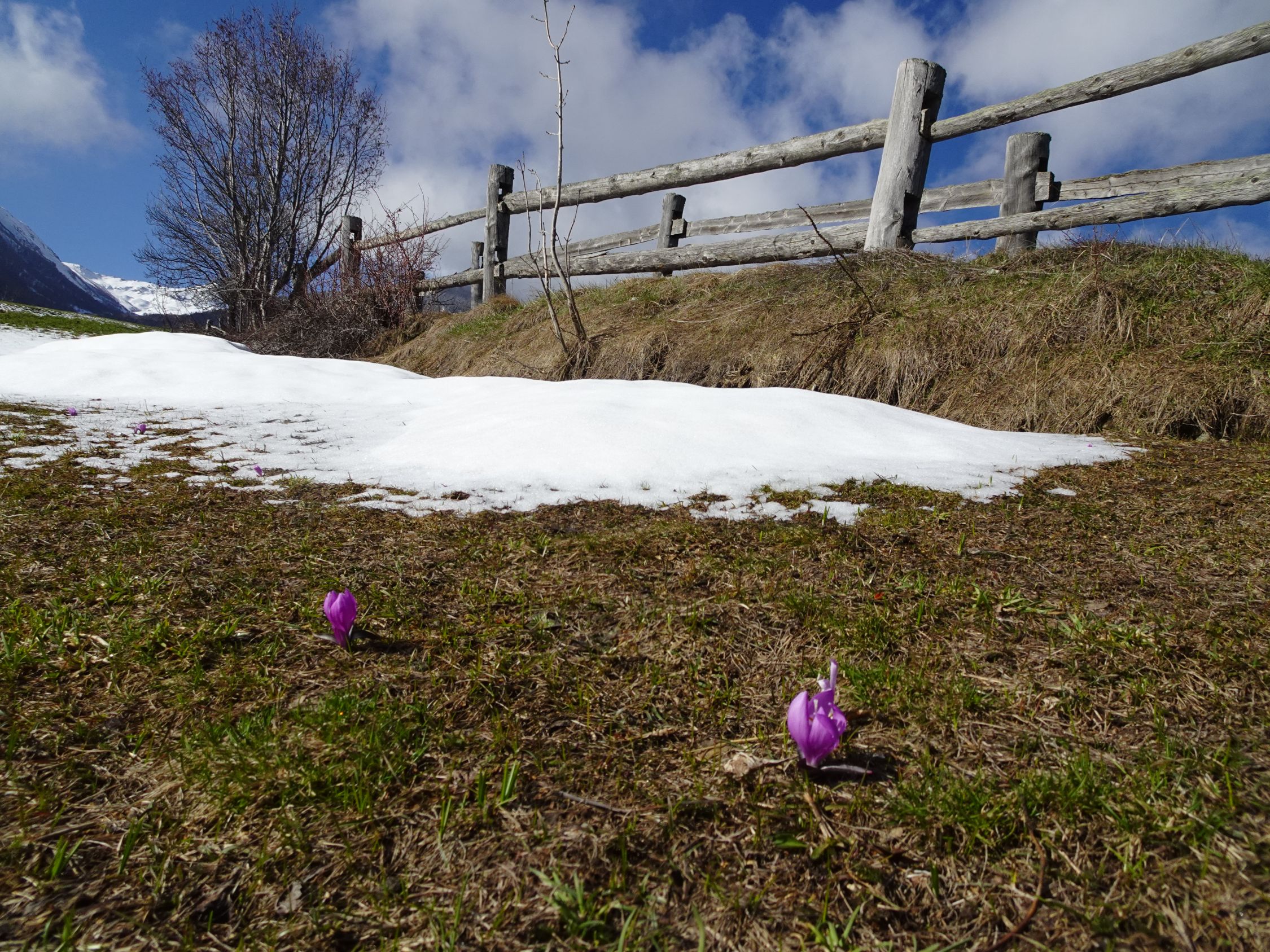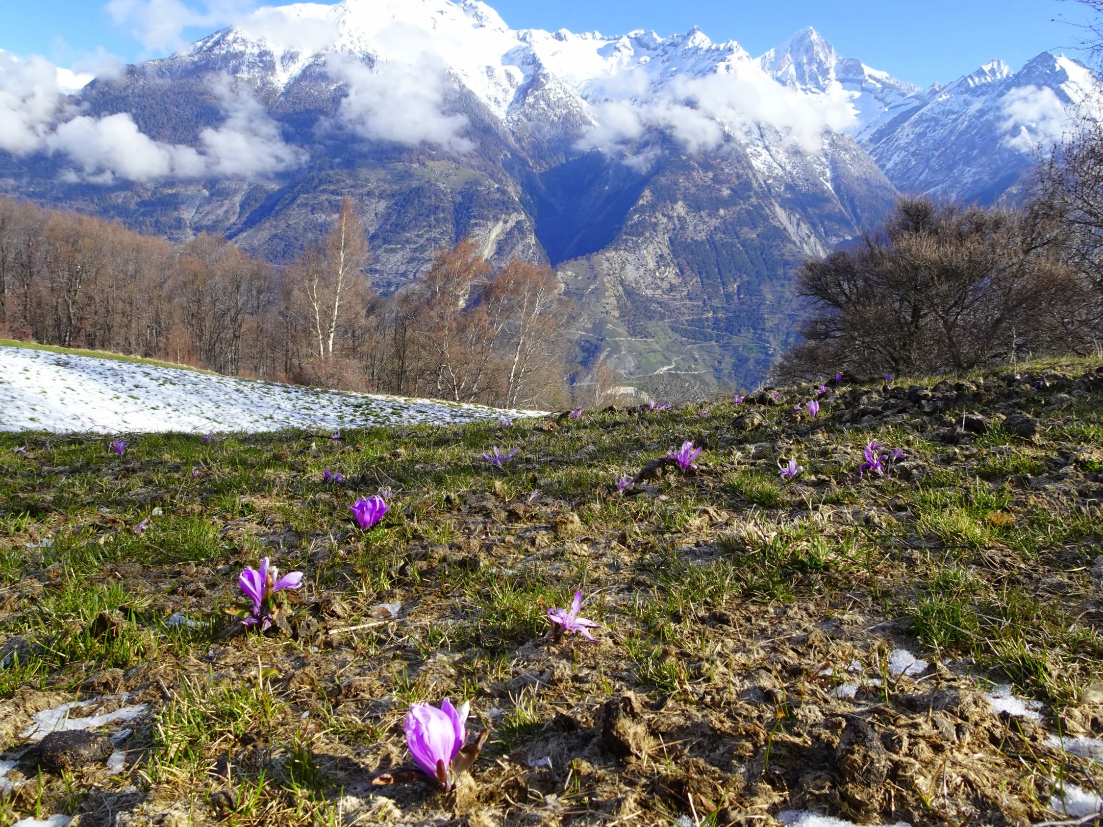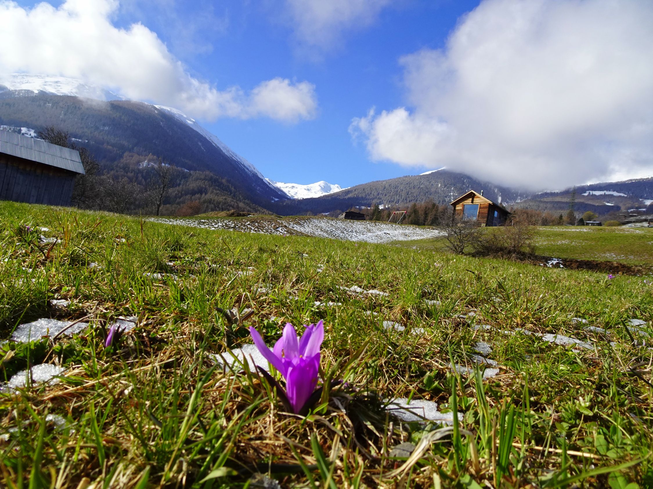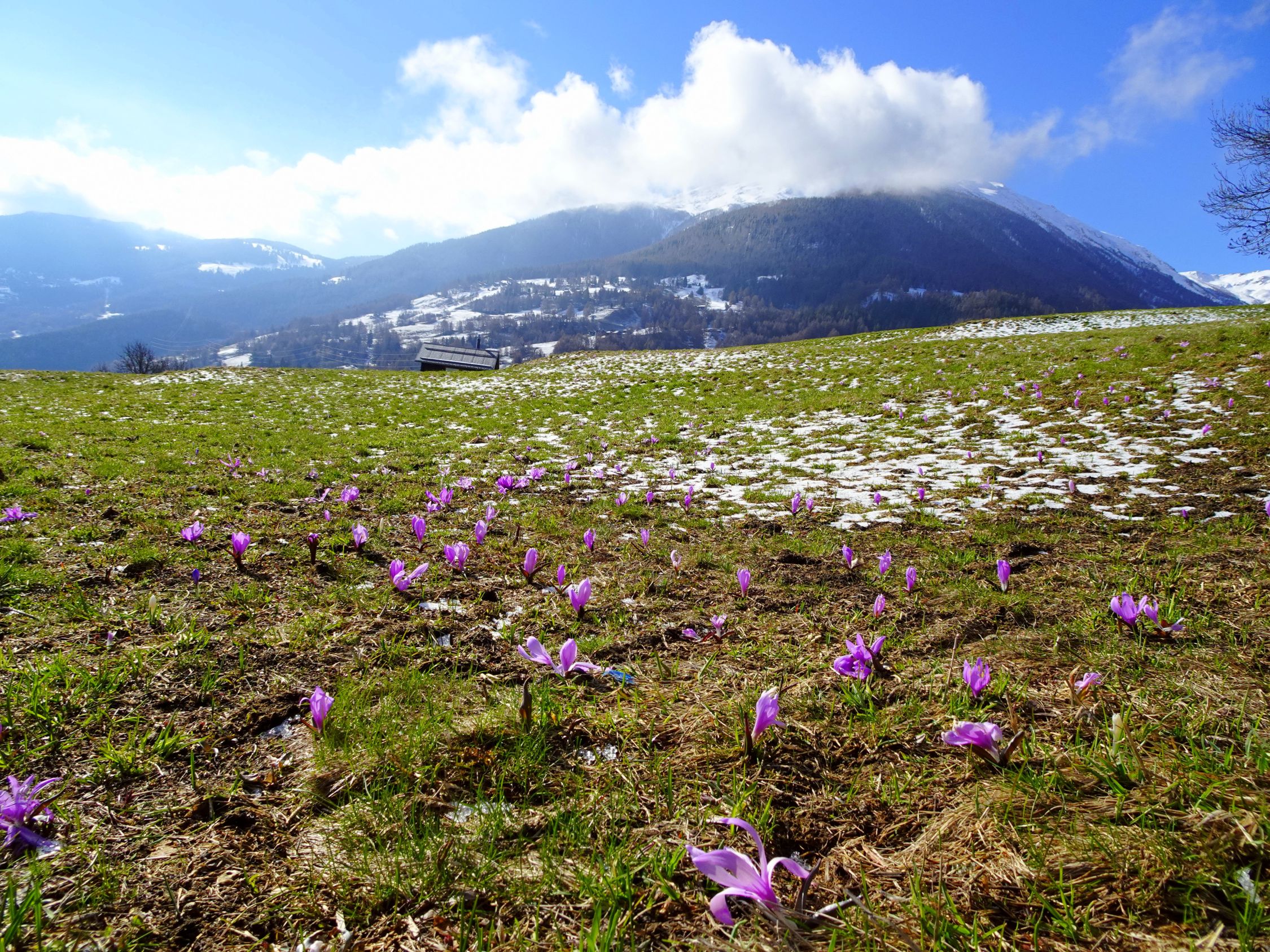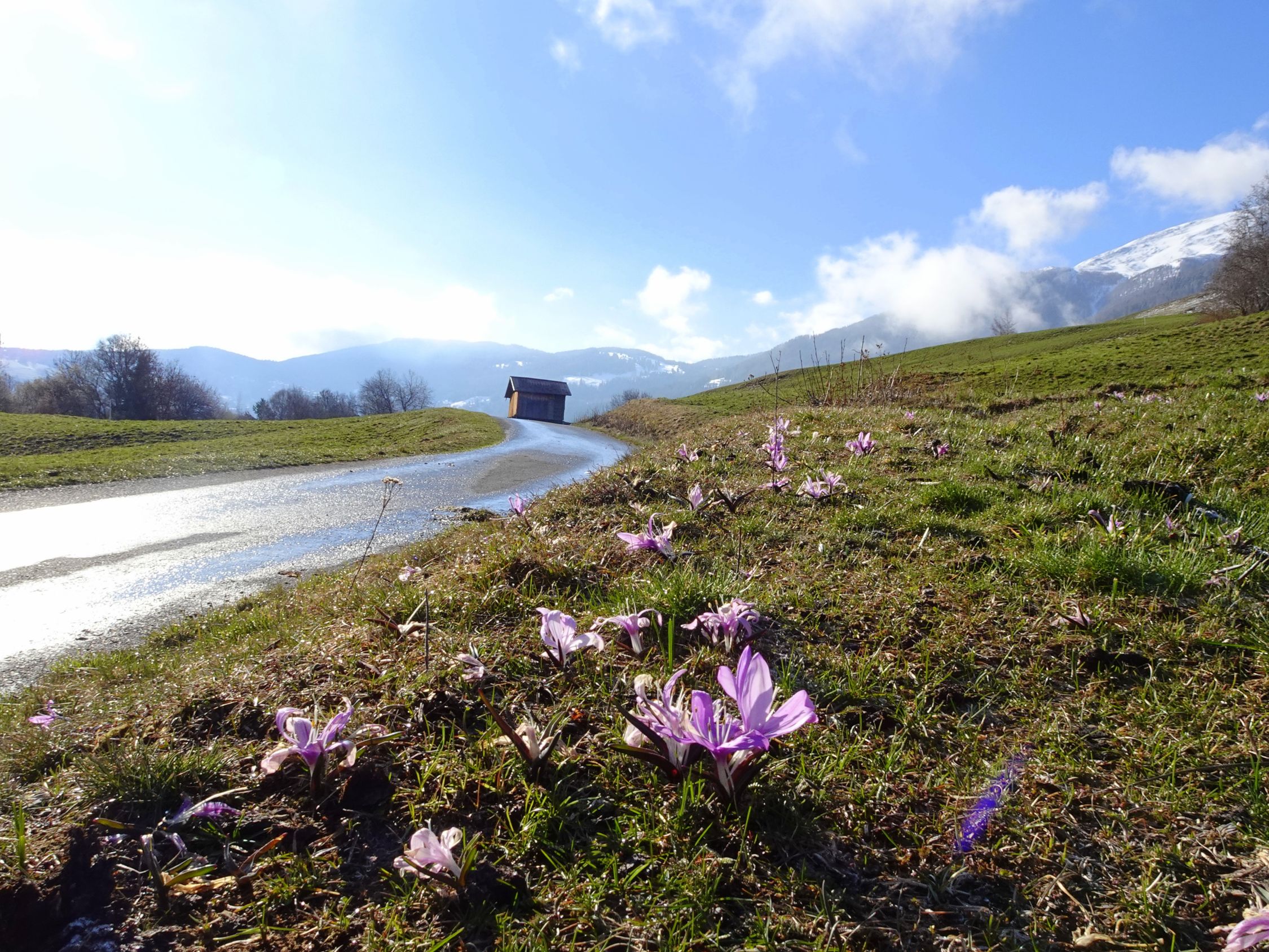 Einfacher: Hinter der Bahnstation geht man hinauf bis zur Kreuzung, hier folgt man der nach rechts aufsteigender Fahrstrasse bis zu einer Abzweigung nach links (Wanderwegweiser "Lichtblumenweg" an der Mauer. Nun steil links hinauf am Rest. Alea vorbei und weiter steil bis zur Fahrstrasse die von rechts kommt. Hier beginnt die Zone mit den Lichtblumen. Nun folgt man dem Lichtblumenwegweiser und schwärmt links und rechts der Strasse wo man die Blumenfelder sieht. Weiter dem Weg hinauf bis Oberhiischru und ca 100 m. oberhalb trifft man auf Wegweiser und auf die Alte Erschlersuon. Der folgt man nach rechts bis Habere und dann wieder rechts hinunter nach Eischoll. Dies ist die Hauptroute, man kann verschiedene Varianten begehen, je nach Schnee- und Blumenstand.