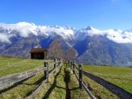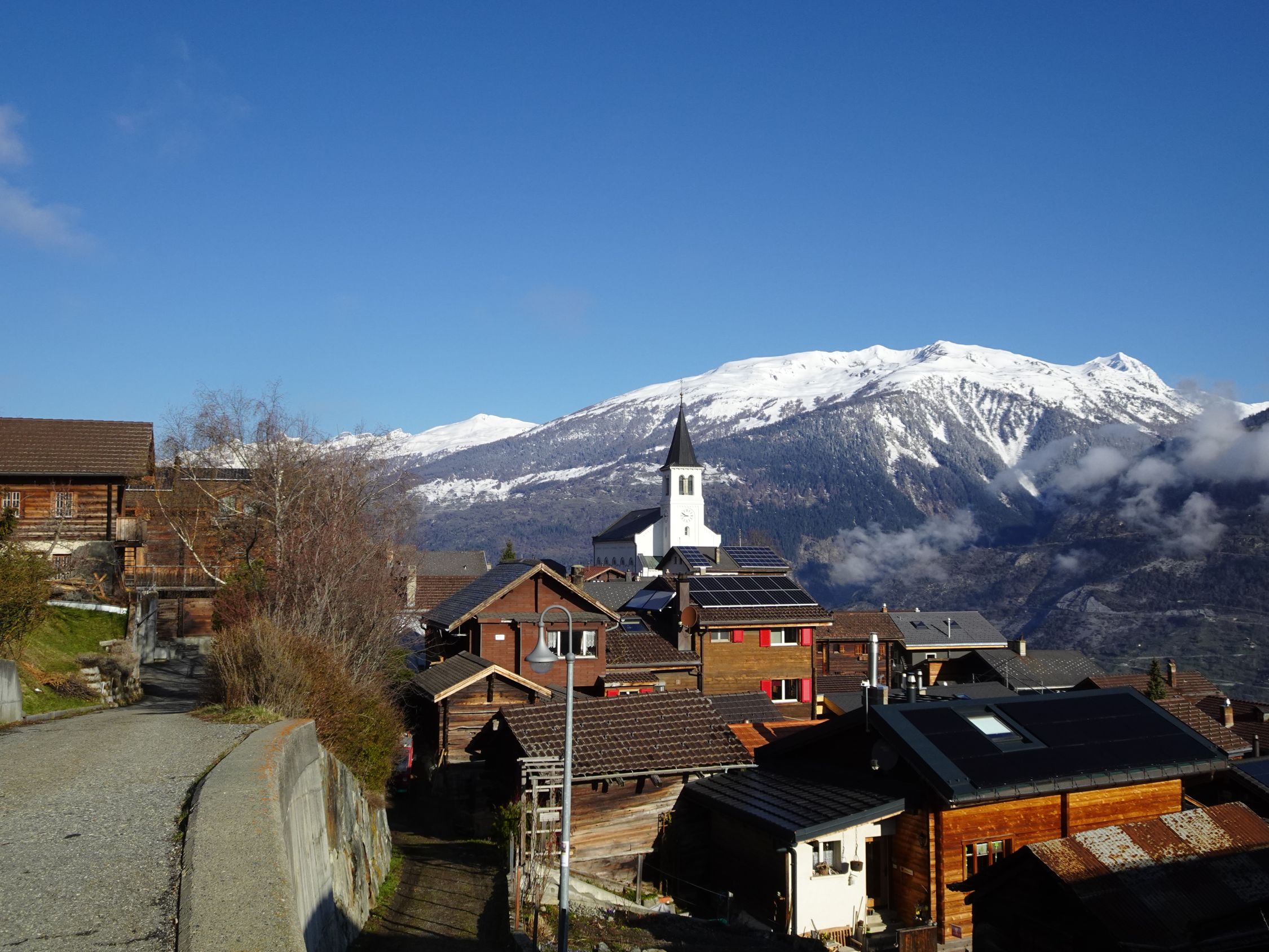 Von Raron mit Seilbahn nach Eischoll. Hier Wanderwegweiser "Lichtblumenweg" der zuerst ins Dorfkern führt beim Dorfplatz um zurückzukehren bis zur Fahrtrasse.