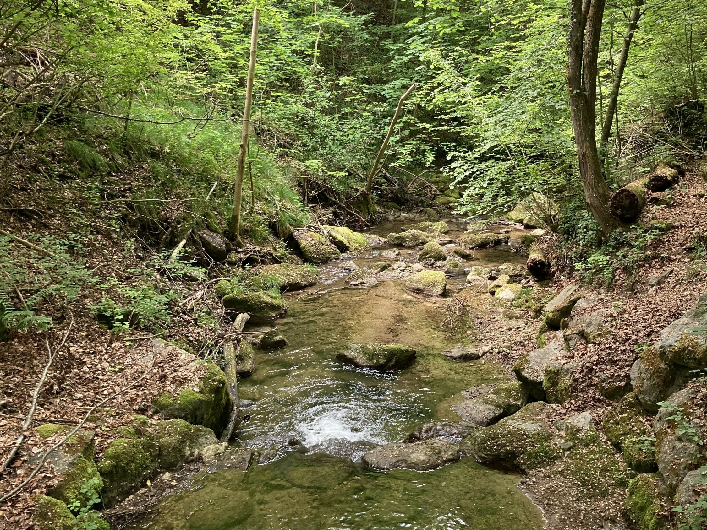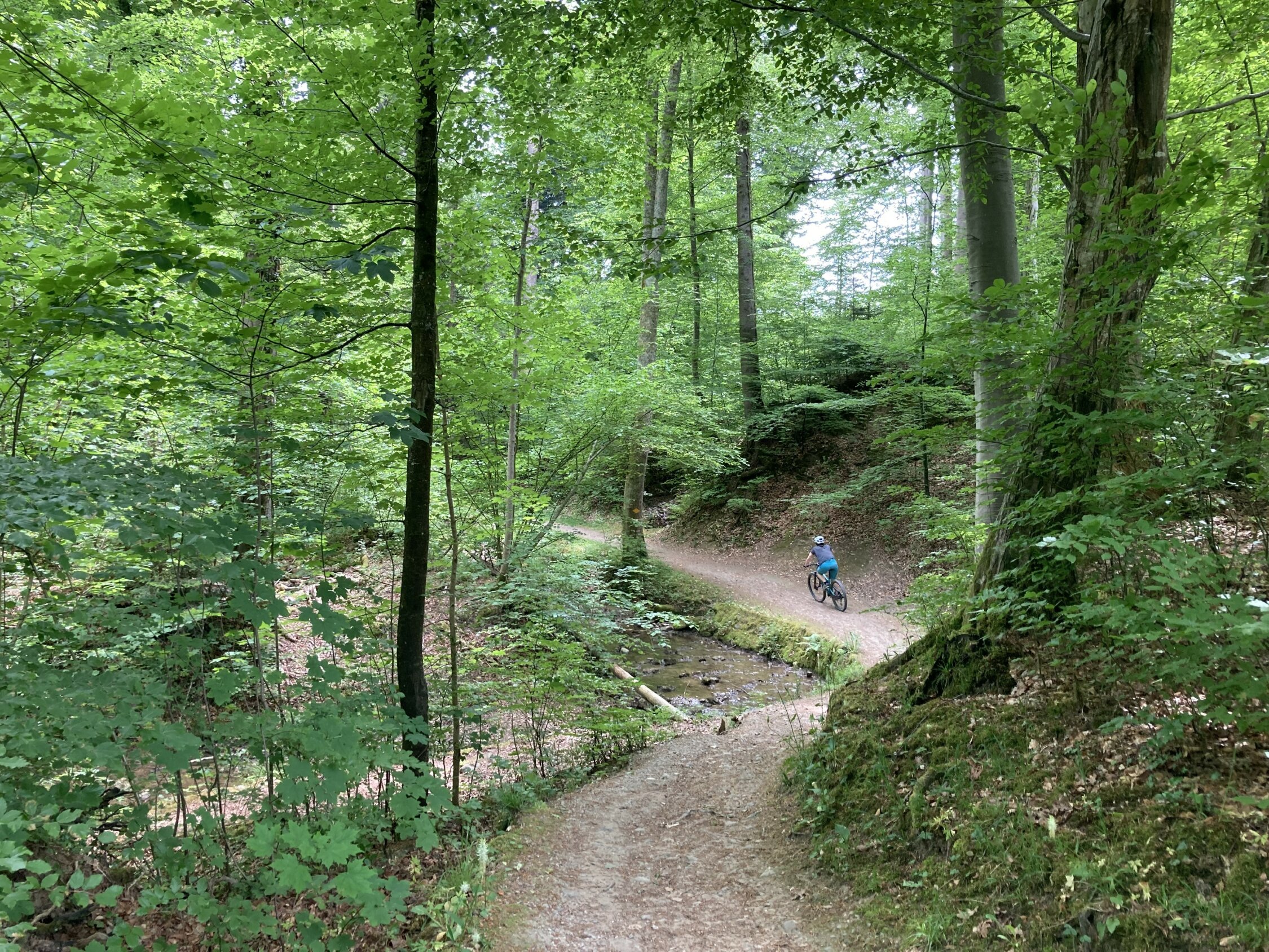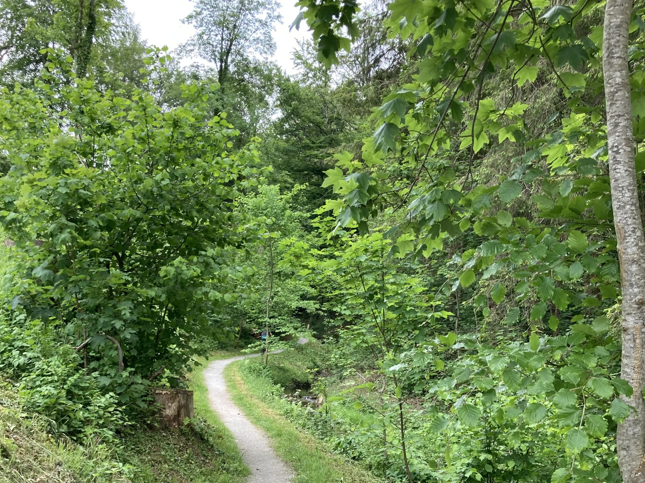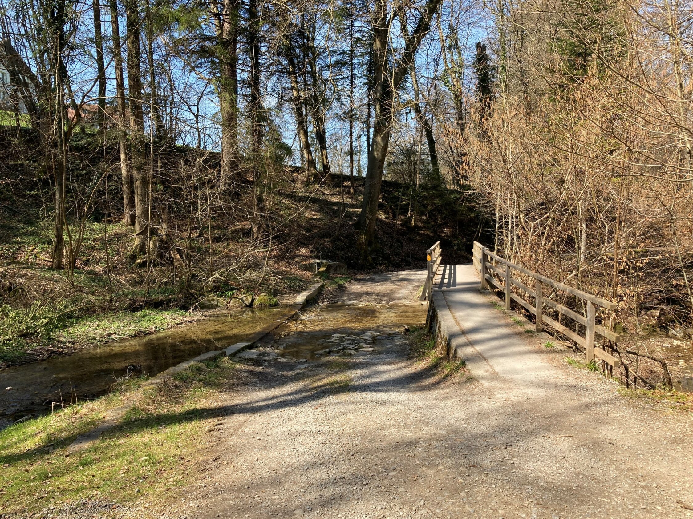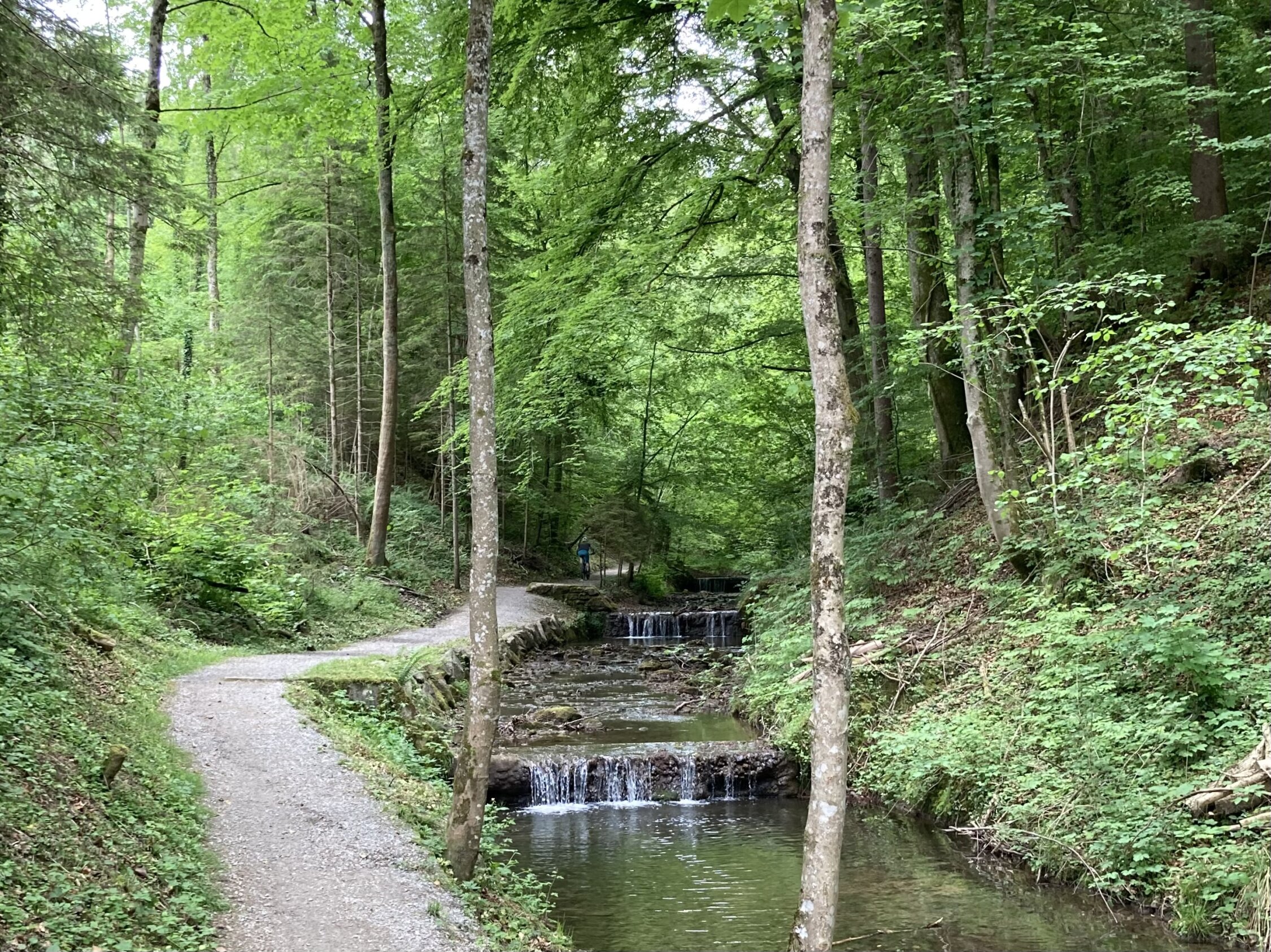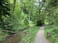 Dem Wehrenbach entlang auf einfachem Trail bis Trichtenhausen. Dort kurz auf die Strasse aber schon vor der Brücke wieder in den Wald und weiter dem Wehrenbach entlang.