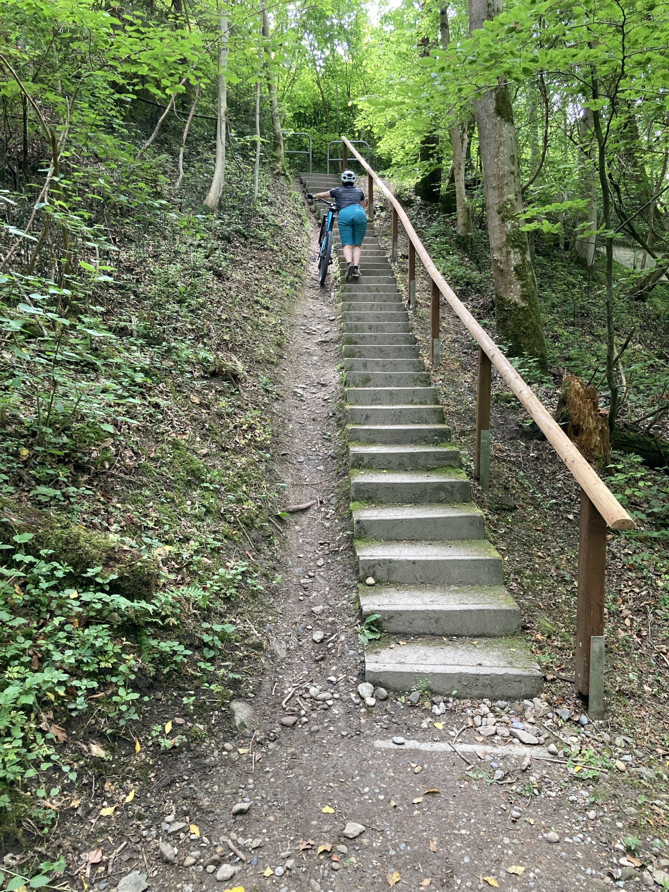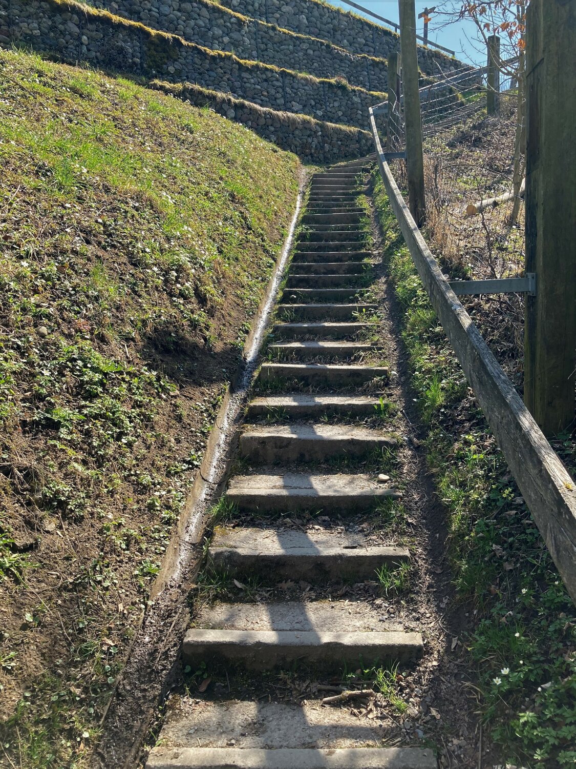 Dem Dorfbach mit einigen kurzen Unterbrüchen und einzelnen Treppen aufsteigend bis zur langen Treppe an der Hohrütistrasse folgen.