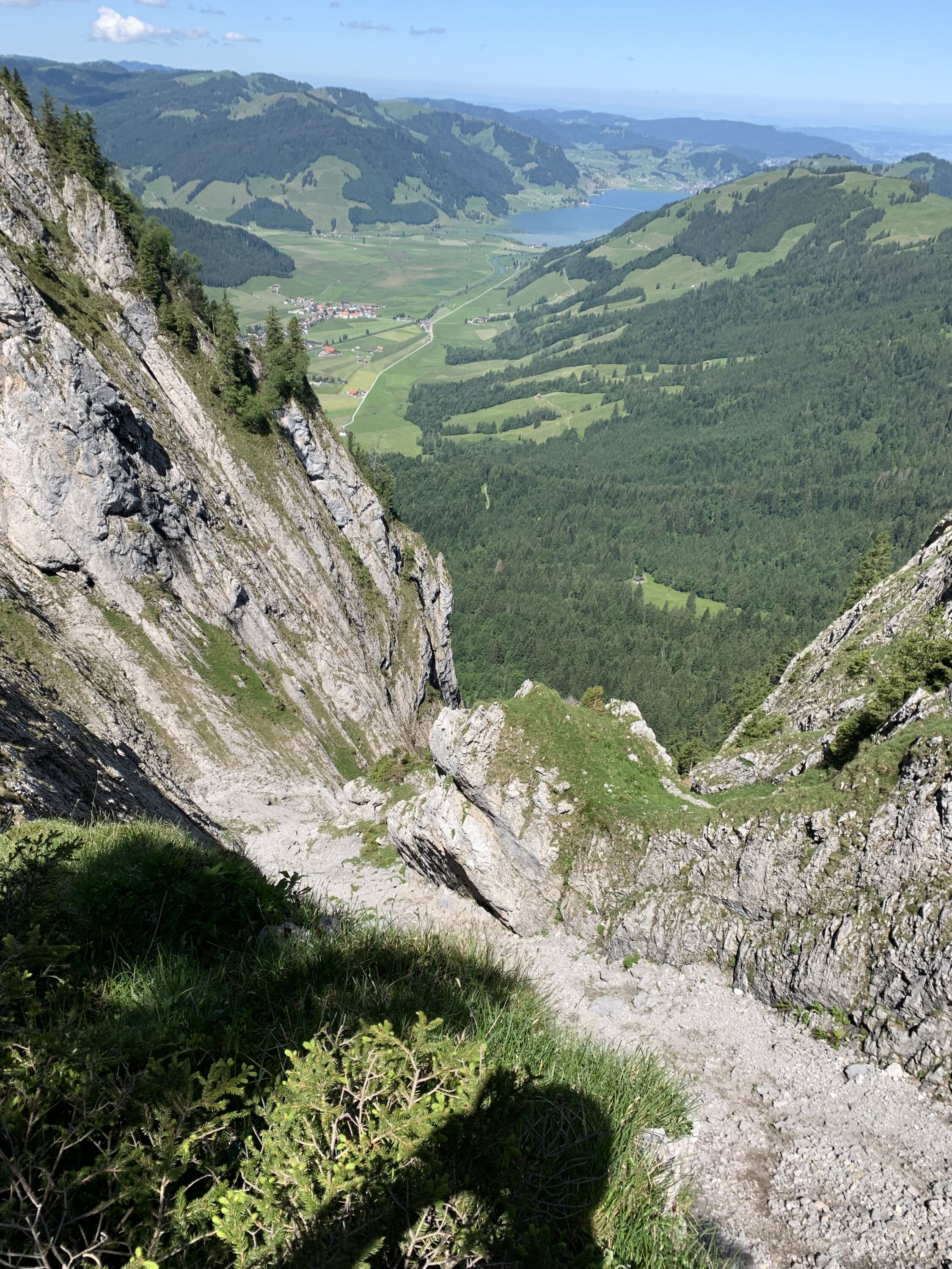 Start in Innerthal Au 911 , an den Ferienhäuschen vorbei via Alpeli zum Fläschlipass 1367 , Abstieg Wisstannenplangg Richtung Ochsenboden P. 1109 an Visieren (Wanderweg Schlammig und Wurzeln durchsetzt) Südöstlicher Bachverlauf aufsteigen. Schlüsselstelle ( ca. 30 m Hoch ) bei ca. 1380 auf dem Grat aufsteigen bald möglichst rechts verlassen . Dem rauhen Talverlauf Chli Sienen weiter aufsteigen ( Achtung Steinschlag ). Dem Geröll Schutt gefülltem Couloir bei ca. 1600 über ein Grasband verlassen . Chli Sienen bei ca. 1800 links halten bis zur Felswand von P. 1949 , Bei 1850 dem obersten Grasband Aufsteigen zum Gipfel Wyss Rössli 2018 . Abstieg das 2te Grassschuttband bis 1900 . Quergang zu P.1942 trifft man den Wanderweg zum Fluebrig 2093 . Abstieg über Wanderweg via Alphütte 1589 Schlänggen 1368 zum Ausgangspunkt .