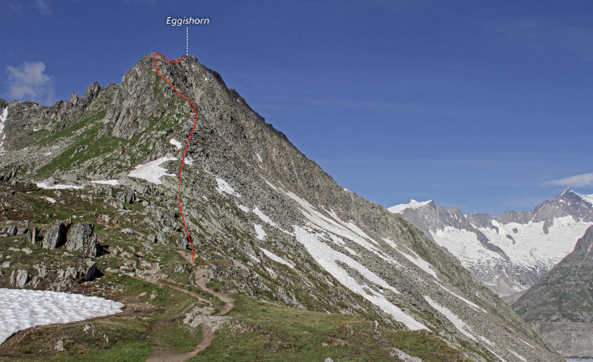 Von der Fiescheralp auf Wanderwegen bis zur Bergstation des Sessellifts Talegga. Von dort auf gleicher Höhe den Nordostgrat (Richtung Tällisee) anpeilen. Auf dem Grat zuerst - teilweise Wegspuren vorhanden - einfach Höhe gewinnen bis zu einem markanten Gendarmen. Dort nehmen die Schwierigkeiten zu. Den Gendarmen eher nördlich er- und umklettern (max. III-). Der Gratkante entlang hoch auf den Gipfel klettern und kraxeln. Zuletzt wieder einfaches Blockgelände.