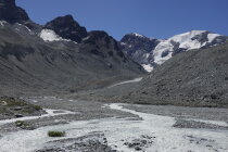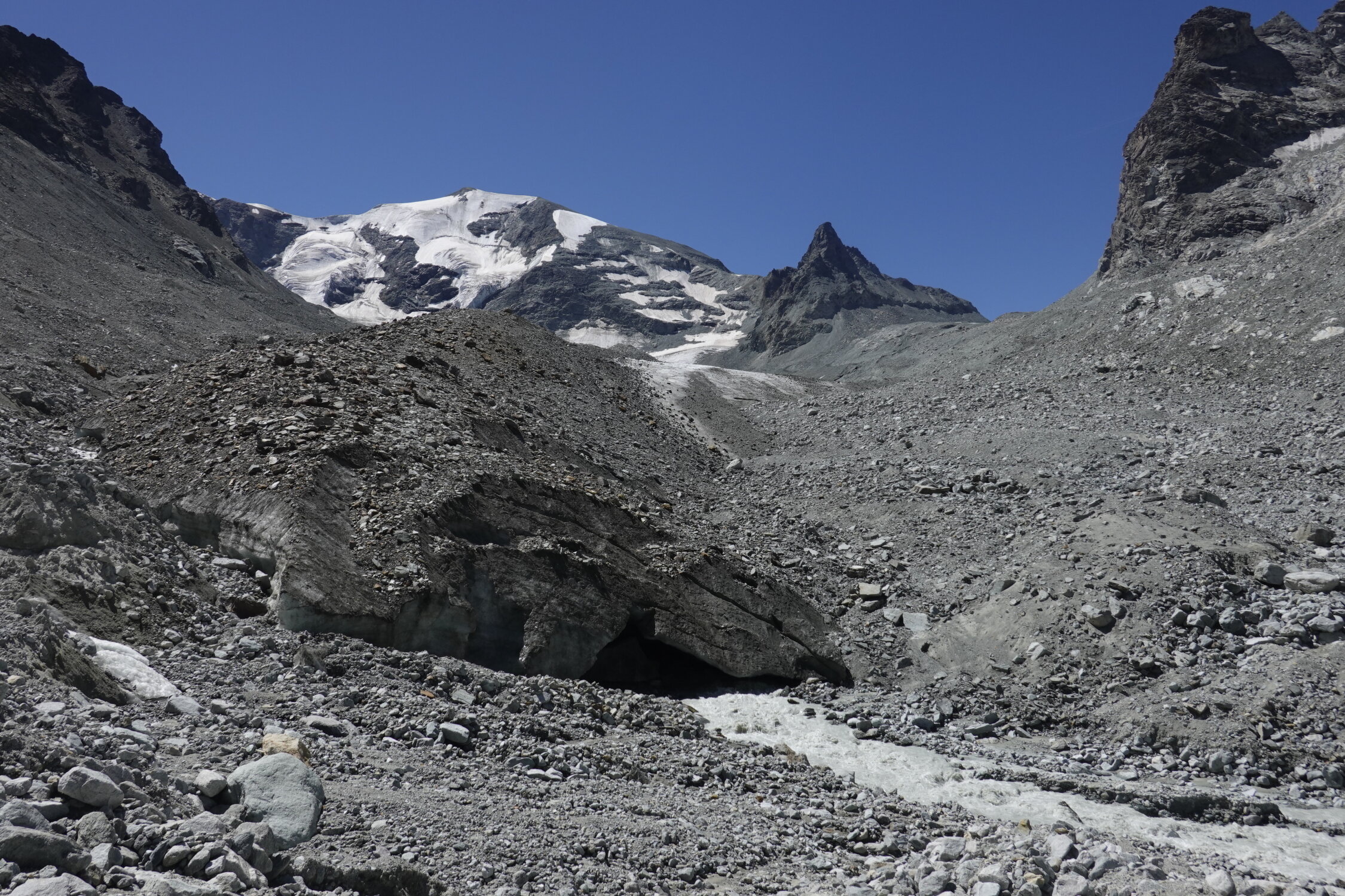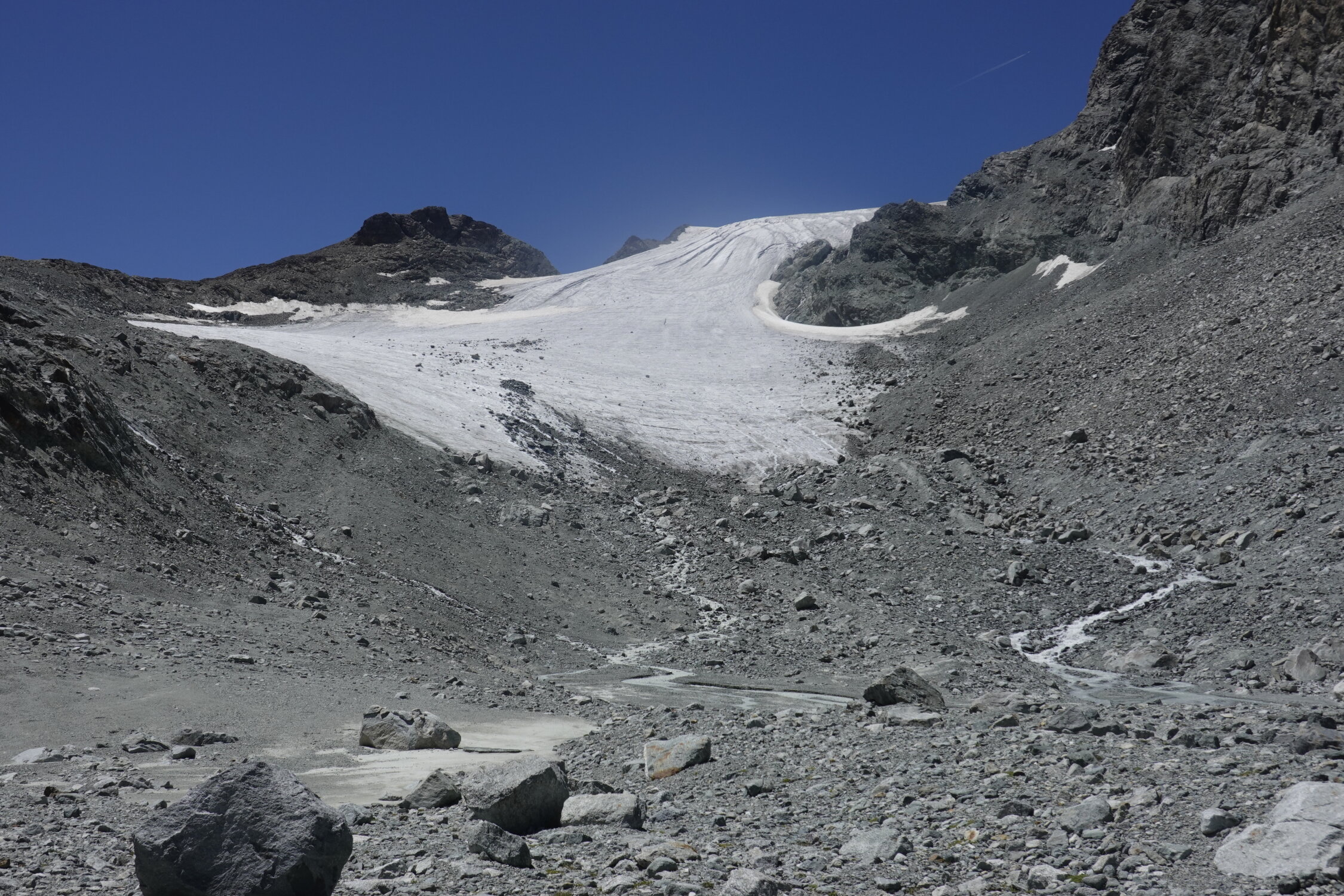 Steigeisen können evtl. nötig sein. Auf das auf verschneiten Gletschern gebotene Anseilen kann wohl definitiv verzichtet werden. Mitte Juli 2022 war der Gletscher bis zuoberst vollkommen ausgeapert, und dabei waren in der Nähe der Route keinerlei Spalten vorhanden. Kurz vor dem Pass war ein Schmelzwasserbach bis zu ca. 1 m ins Eis eingeschnitten - würde man bei Neuschnee hier einbrechen, könnte das erschreckend wirken, wenn man glaubte, in eine Spalte zu stürzen.